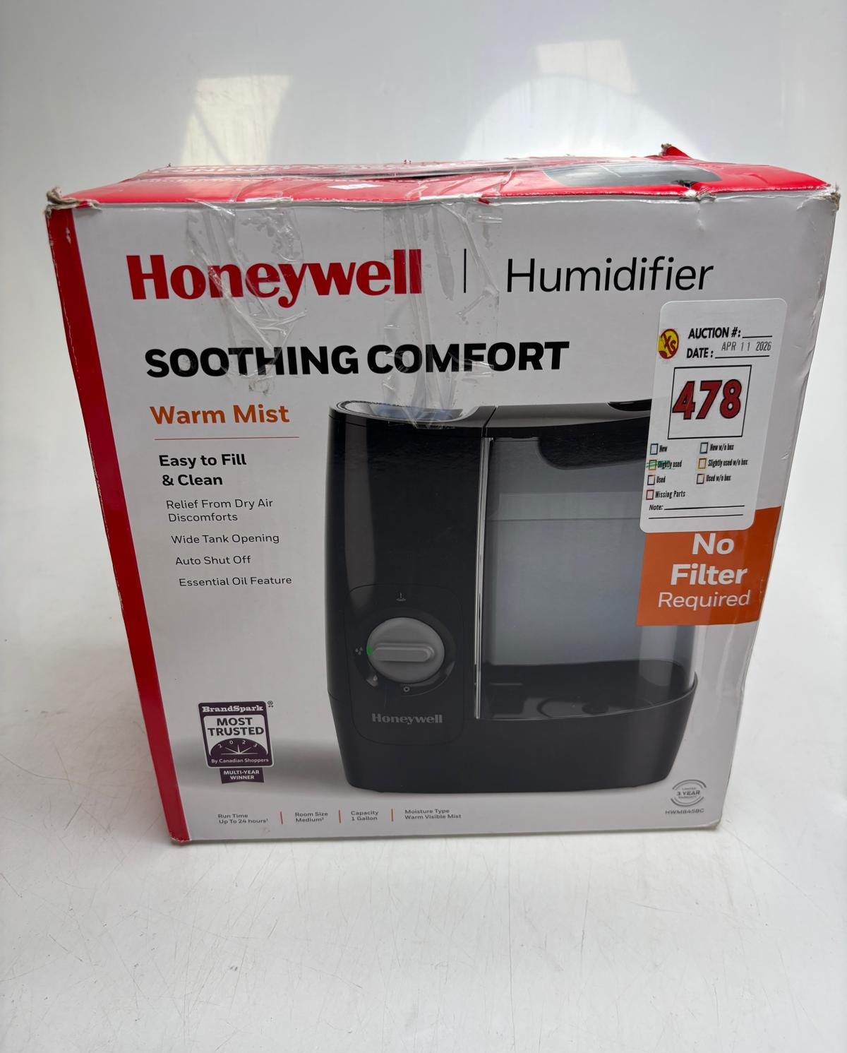 Lot 478 HONEYWELL HWM845BC SOOTHING COMFORT WARM MIST HUMIDIFIER, BLACK -SU