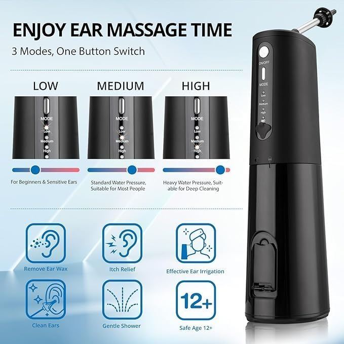 - Quick & Painless Ear Washing: With 3 water pressure Modes ranging (low, medium and high), this earwax removal kit takes only seconds to clean your ears. you can choose the most suitable flushing force.