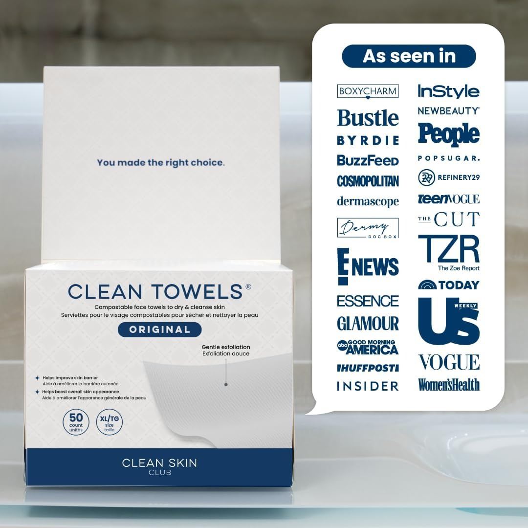 - Clean Skin Club Clean Towels XL, 100% USDA Biobased Face Towel, Disposable Face Towelette, Eczema Association Accepted, Makeup Remover Dry Wipes, Ultra Soft, 1 Pack, 50 Count
