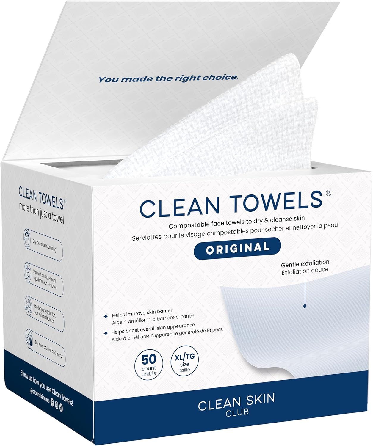 - Clean Skin Club Clean Towels XL, 100% USDA Biobased Face Towel, Disposable Face Towelette, Eczema Association Accepted, Makeup Remover Dry Wipes, Ultra Soft, 1 Pack, 50 Count