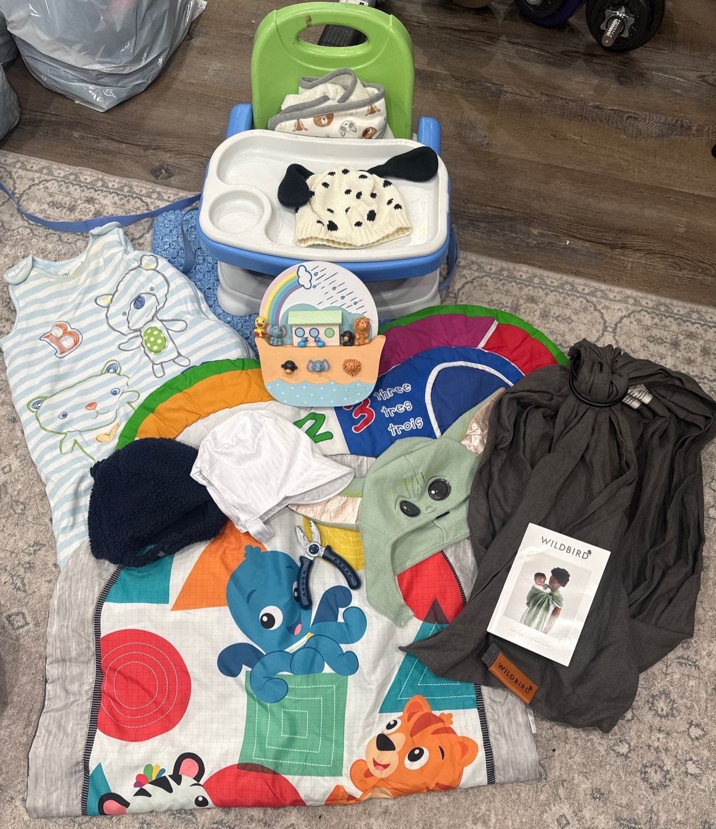 Bundle of Toddler Activity Blankets, Music Box, Portable High Chair, Yoda Panda Toque Wildbird Baby Carrier & More