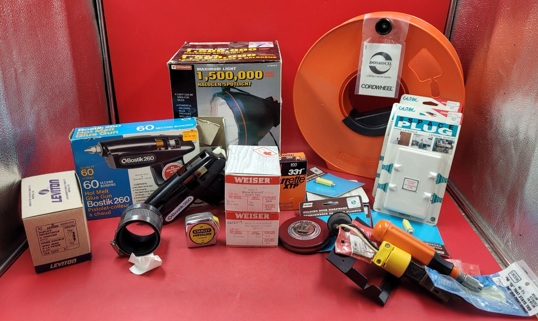 Lot 687 Garage tools, Spotlight, cord wheel, glue gun