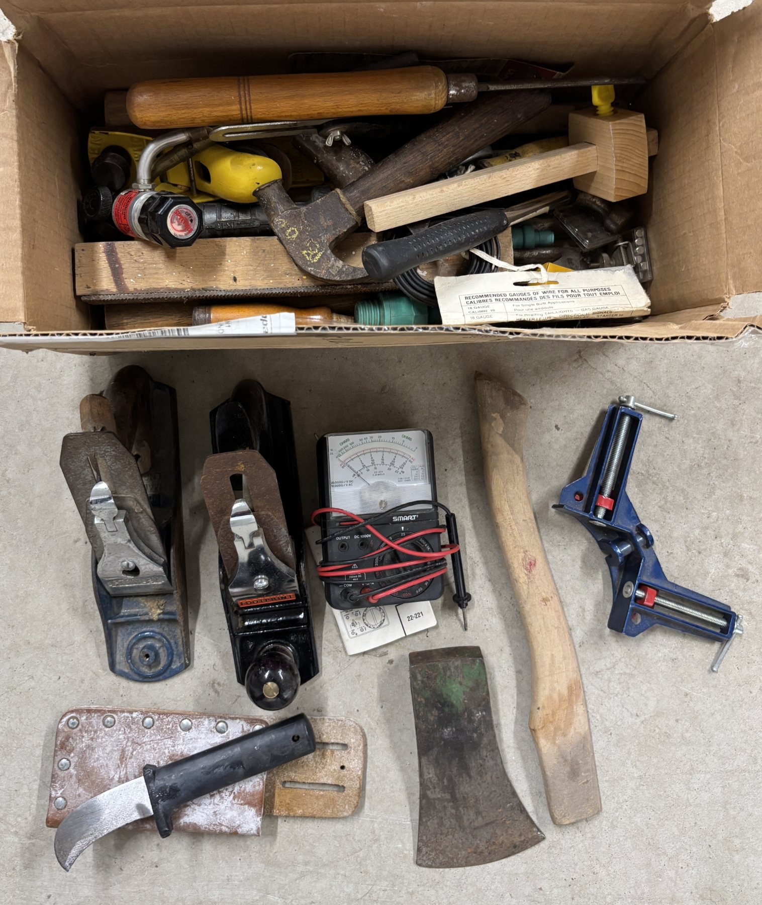 Lot 143 JOB LOT - MISC HAND TOOLS - PLANES, CHISELS, HACHET HANDLES