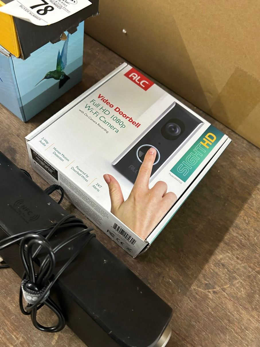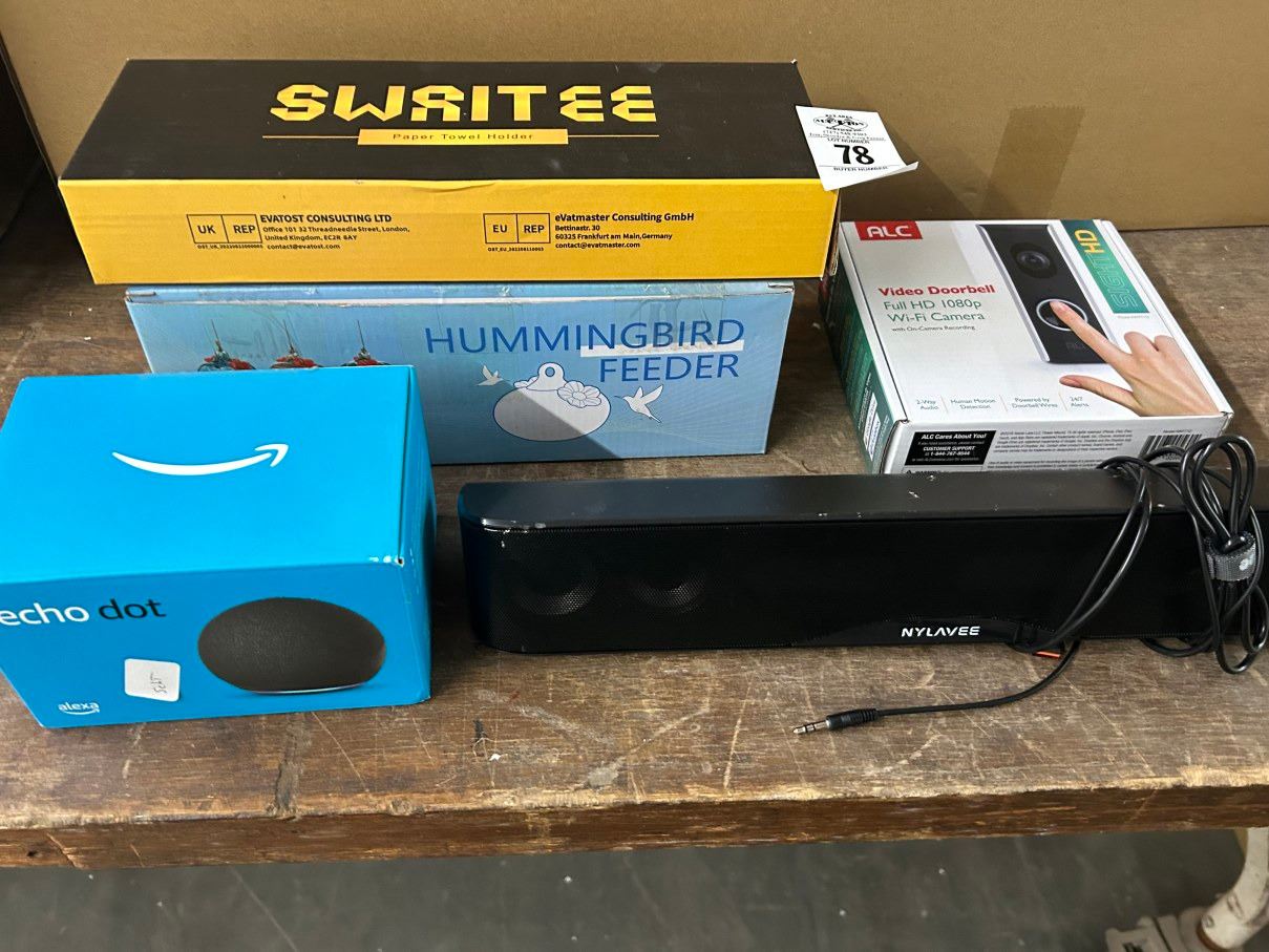 Lot 78 Sound Bar Video Door Bell, Humming Bird Feeder, Echo Dot, Towel Holder