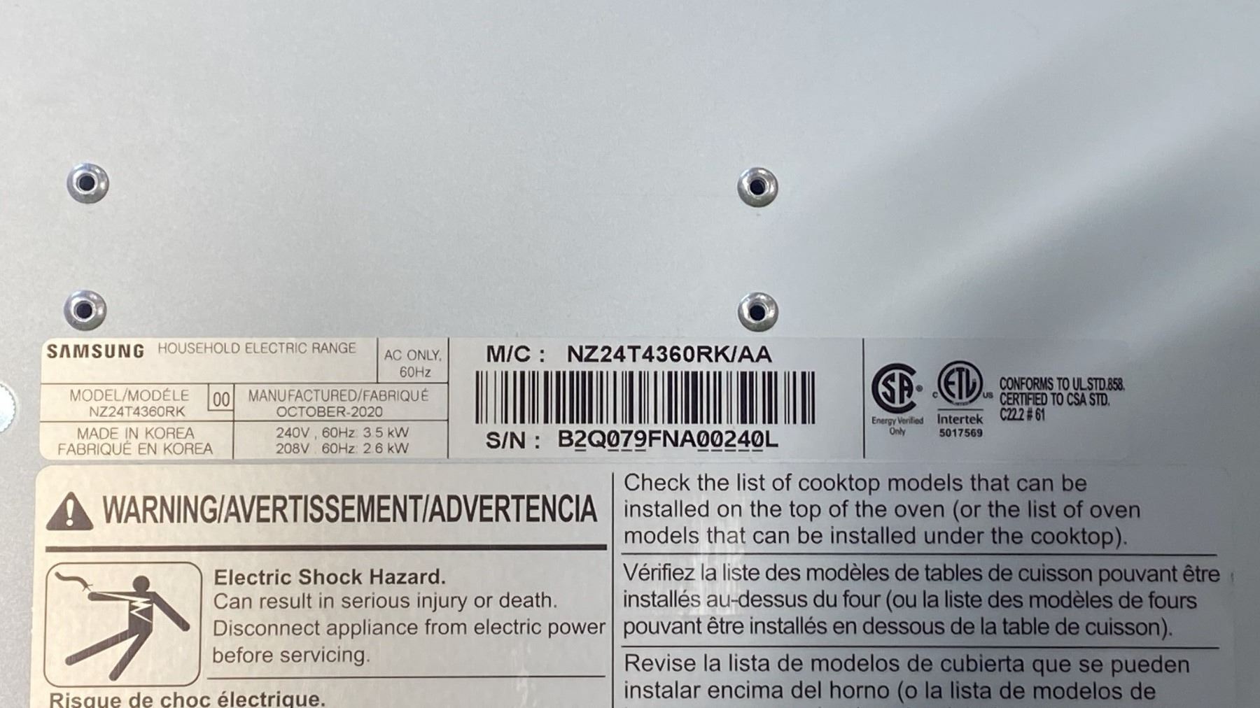 SAMSUNG MODEL NZ24T4360RK. BLACK 24" 4 ELEMENT 24"INCH CERAMIC RADIANT ELECTRIC COOKTOP SN B2Q079FNA00240L RETAIL PRICE $1199.99