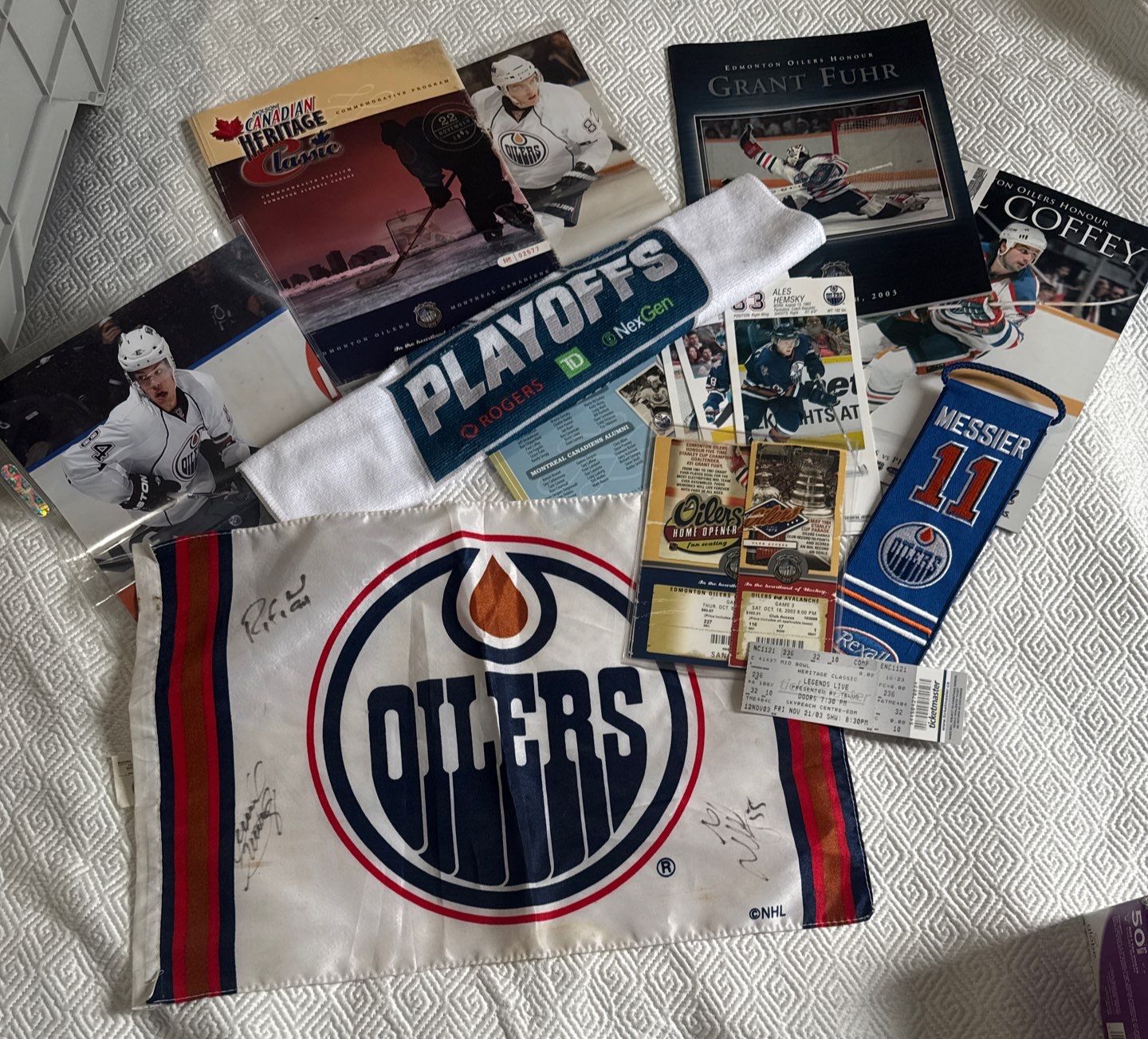 Lot 227 Edmonton Oilers Signed Mini Flag & Heritage Hockey Collectibles Messier Pin-Up +++