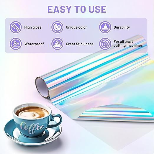 - Holographic Permanent Vinyl for Cricut, 12" x 6FT Silver Waterproofed Iridescent Adhesive Vinyl Roll for All Cutting Machine, Christmas Decorations, Home Outdoor DIY Decor, Decals, Stickers