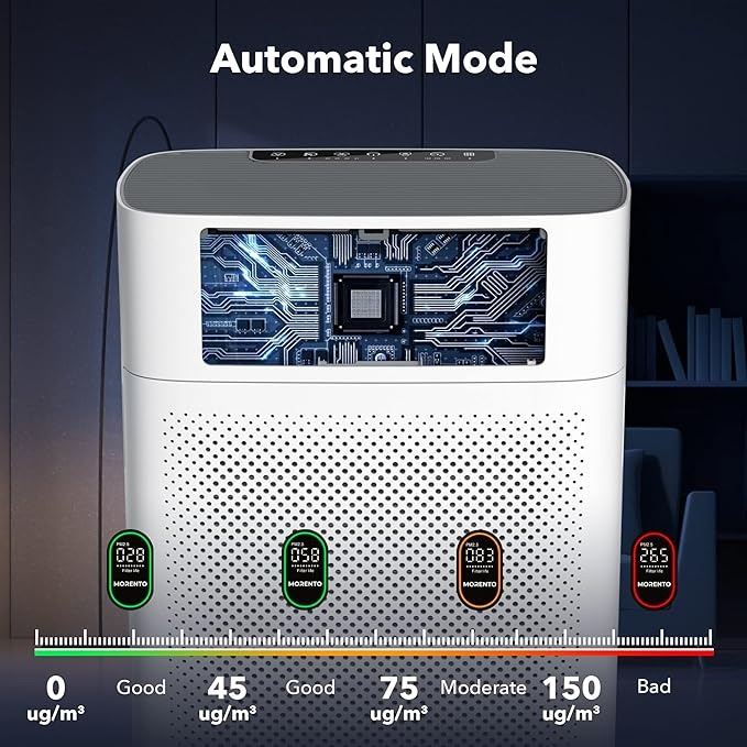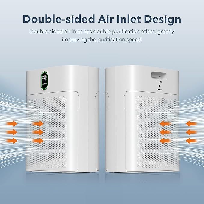 - MORENTO Air Purifiers for Bedroom Home Large Room up to 1076 Sq Ft PM 2.5 Display Air Quality Sensor True HEPA Air Filter Remove the Pet Hair with Double-sided Air Inlet, 24db, White