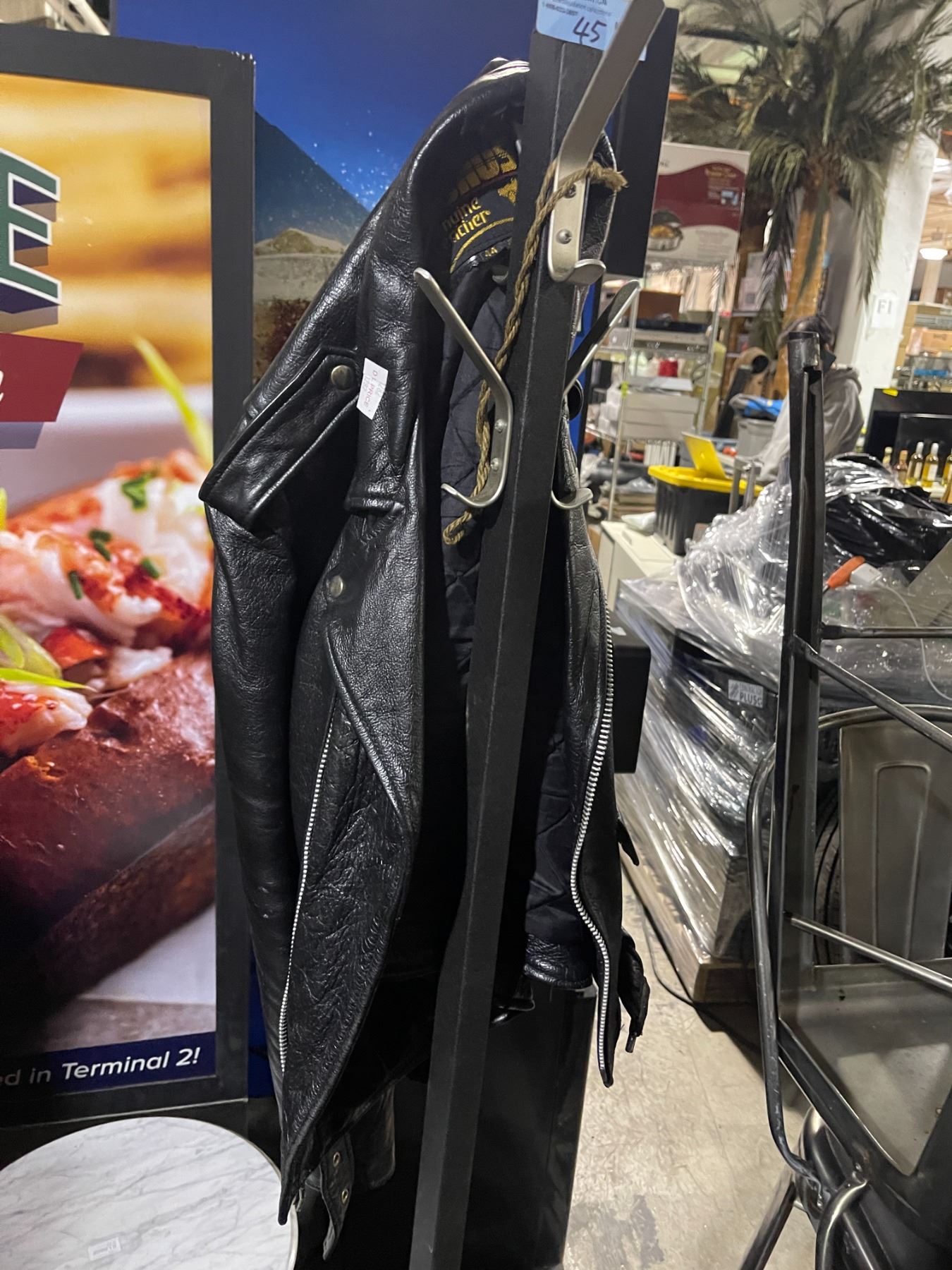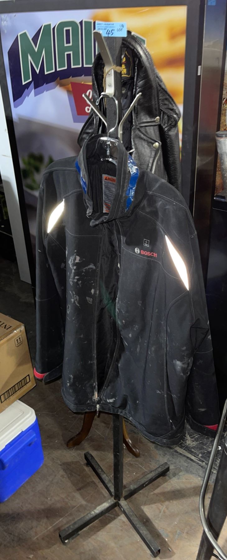 Lot 45 2 Jackets (Black Leather & Bosch) with Metal Coat Stand