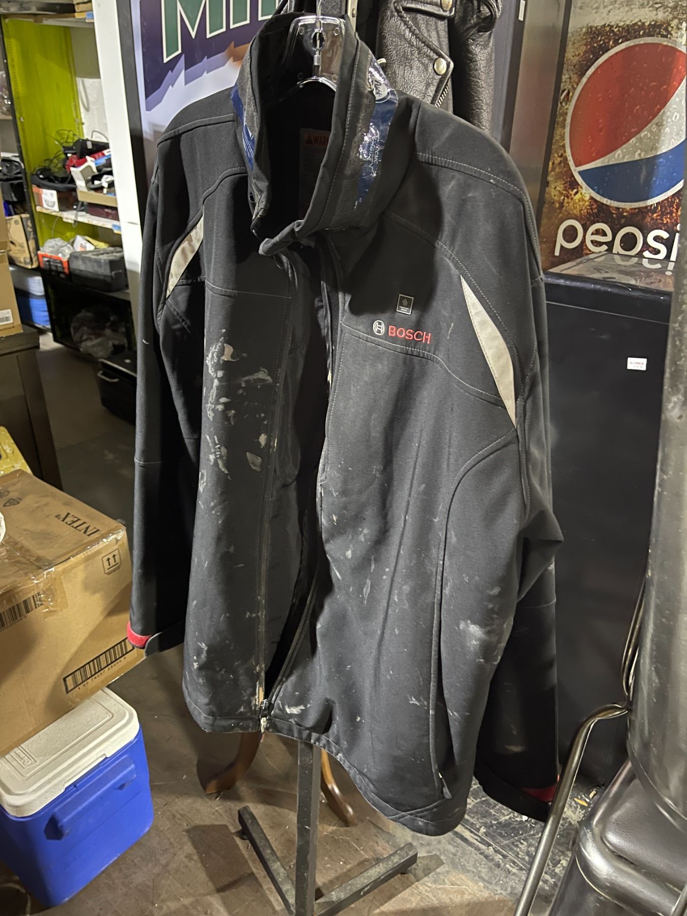 2 Jackets (Black Leather & Bosch) with Metal Coat Stand