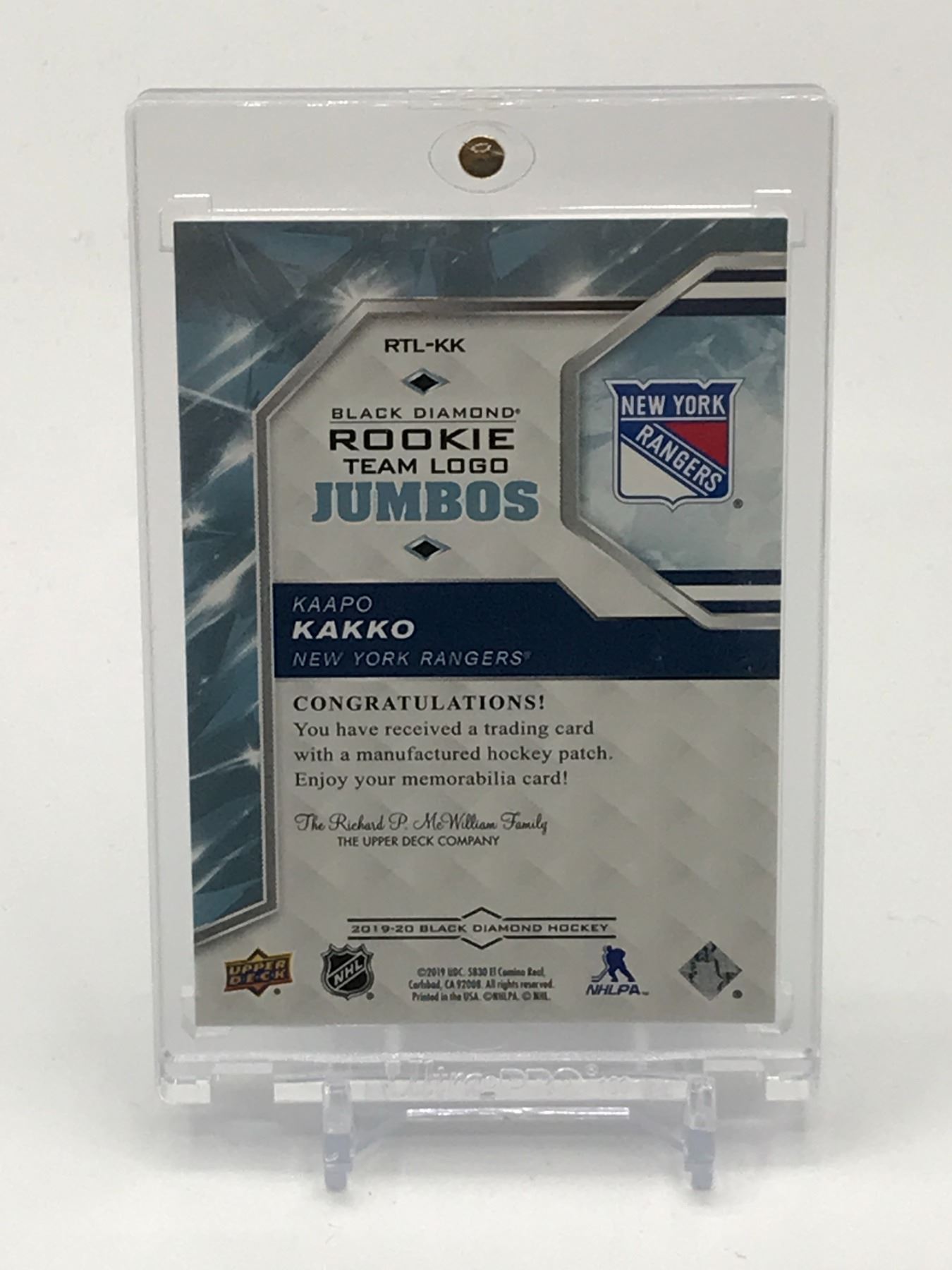Lot 638 2019-20 UPPER DECK BLACK DIAMOND HOCKEY KAAPO KAKKO ROOKIE JUMBOS PATCH TRADING CARD