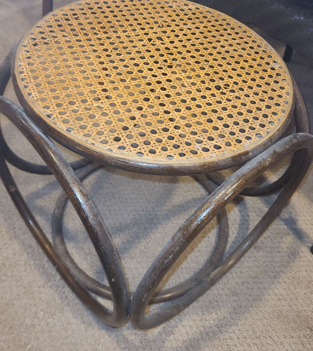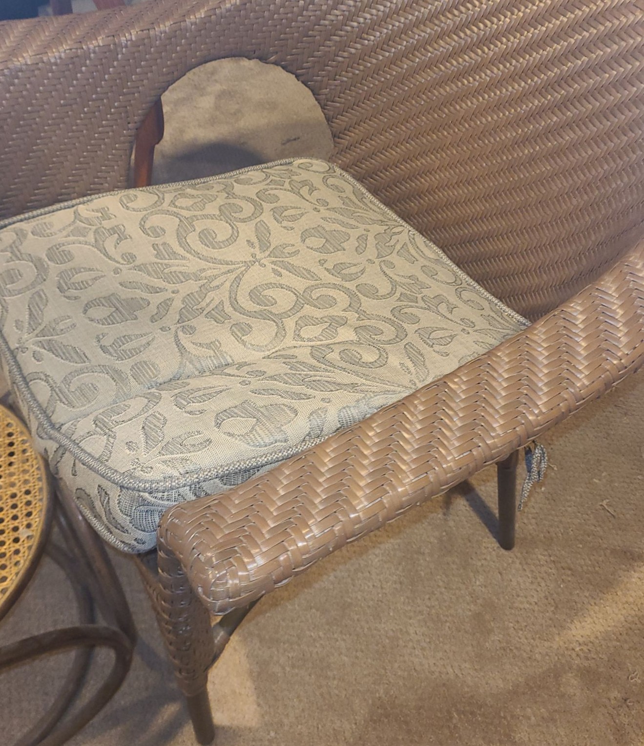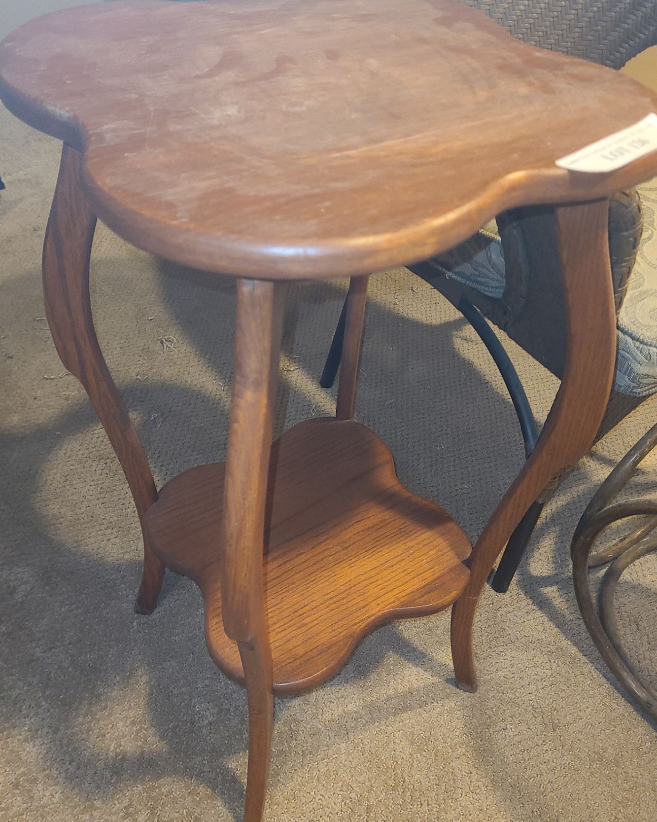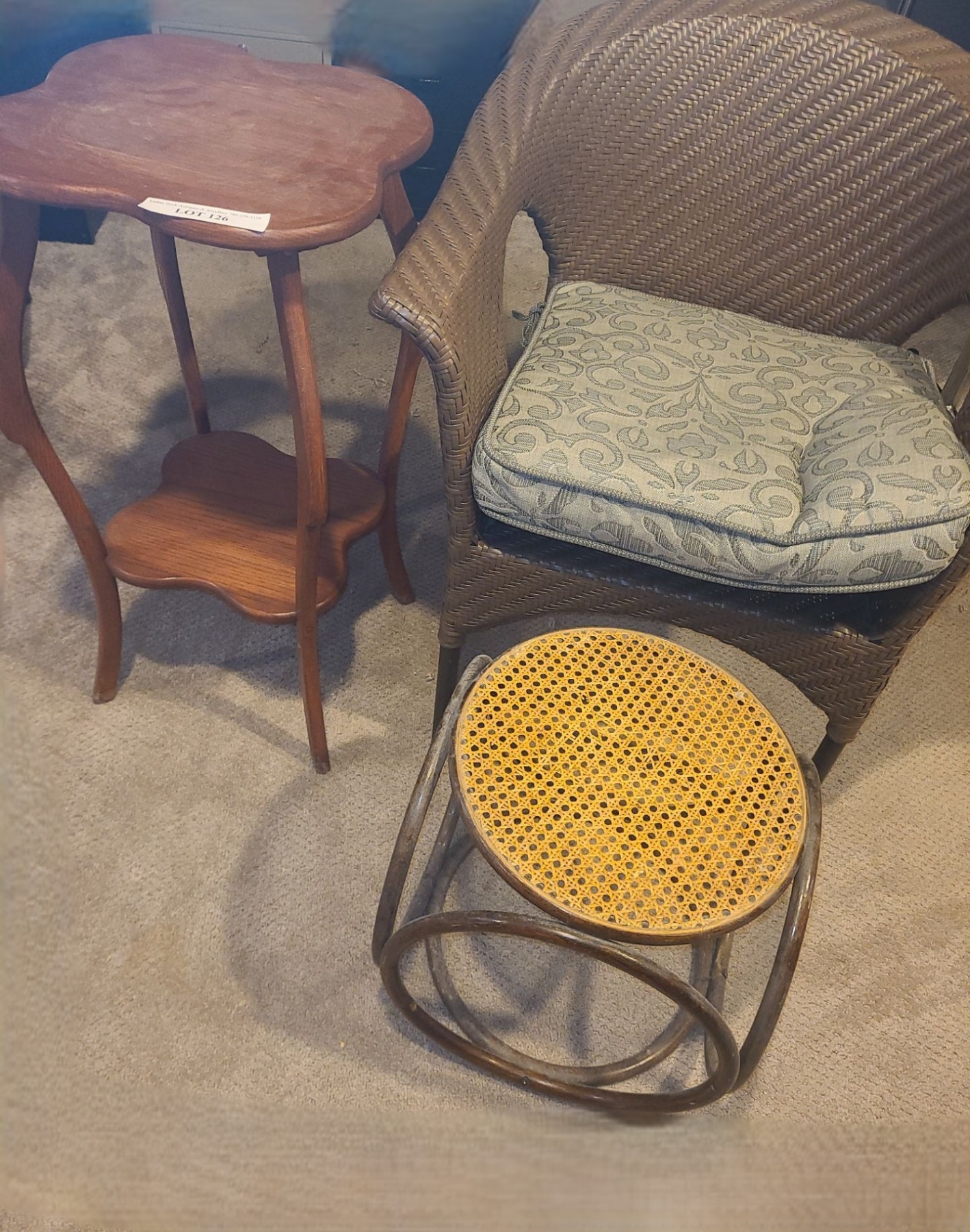 Lot 126 Wood Side Table, Brown Indoor Outdoor Chair w Cushion, Mid Century Modern Ottoman