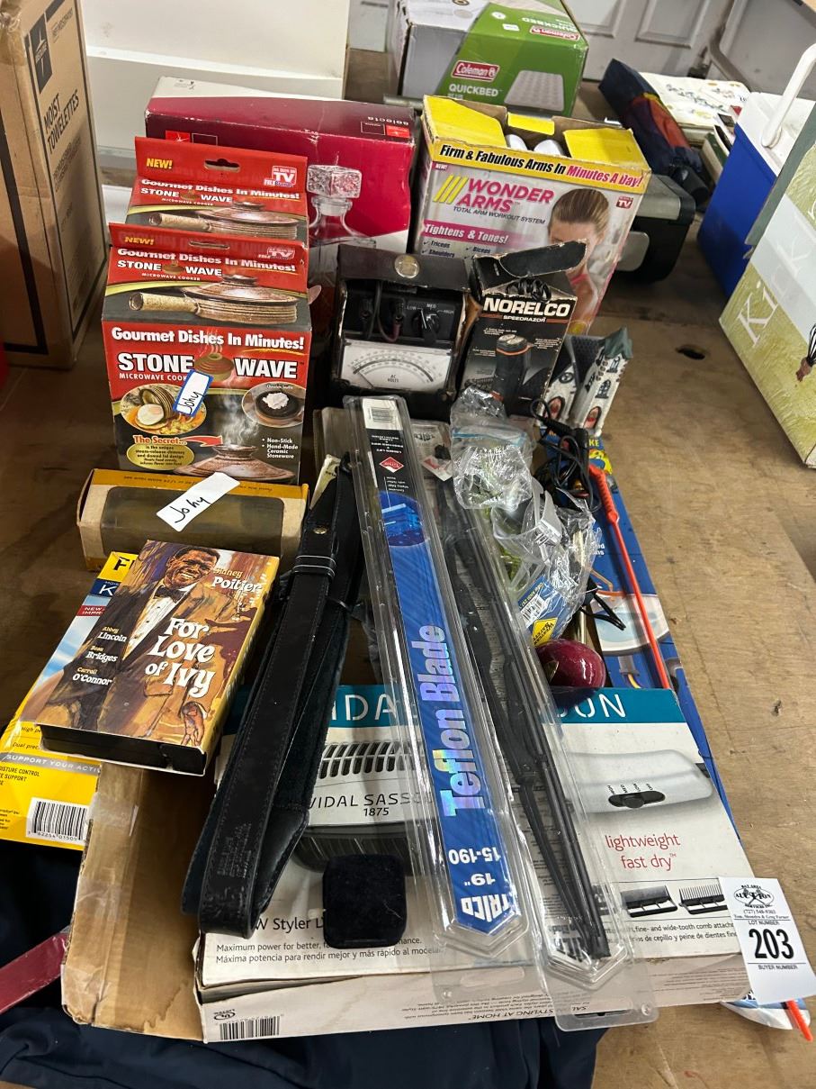 Lot 203 M/W Cooker, Wiper Blades, Tent Fan, Electronics, Home Goods