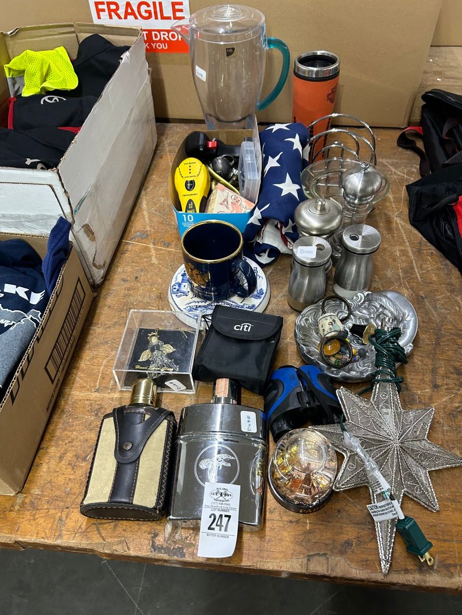 Lot 247 Flasks, Shakers Set, Snowglobe, Flag, Home Goods