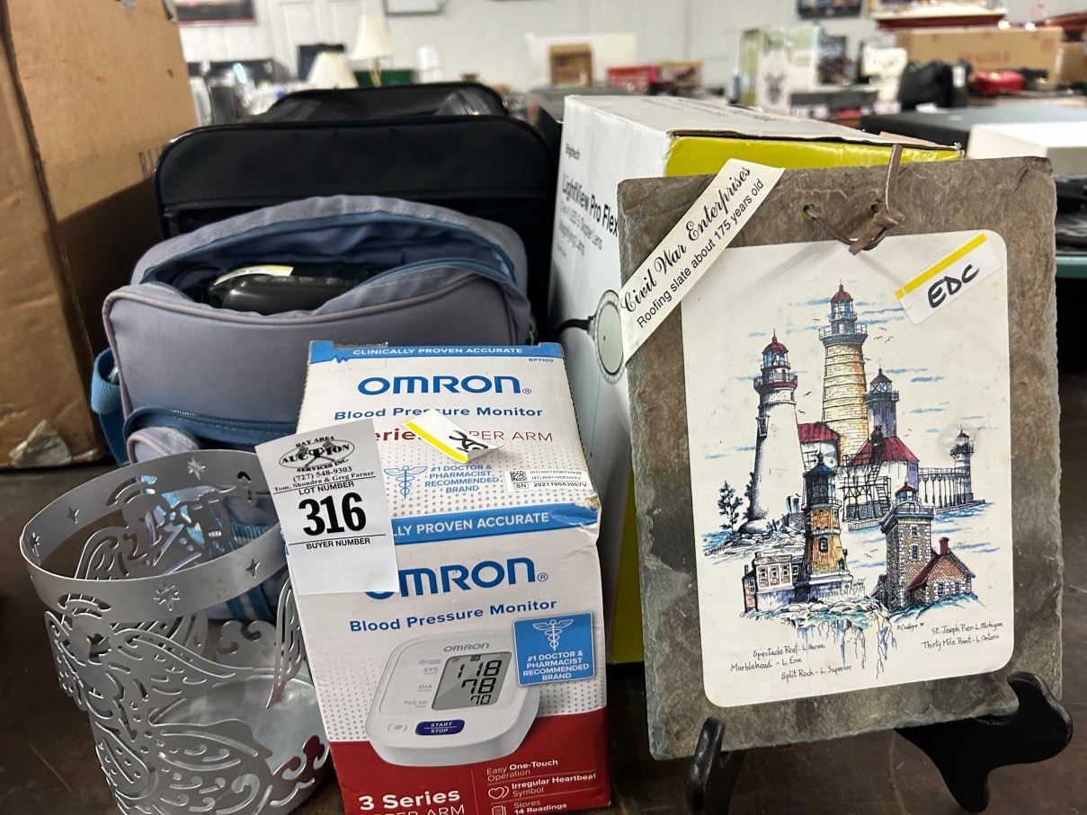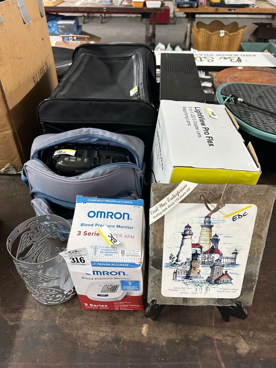 Lot 316 Camcorder, Magna Lamp, BP Monitor, Wall Art, Computer Tower, Pet Carrier