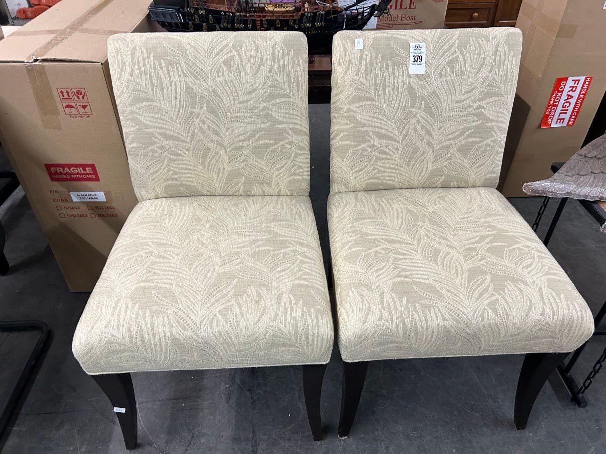 Lot 379 Mocha Leg Beige Palm Motif Padded Easy Chairs - Pair