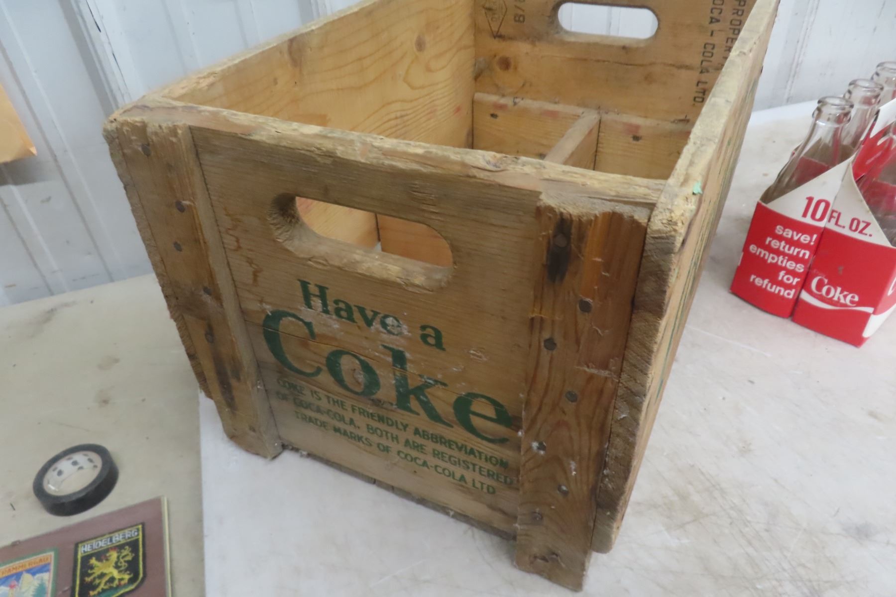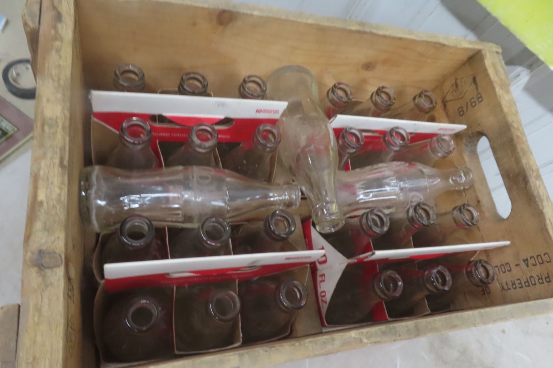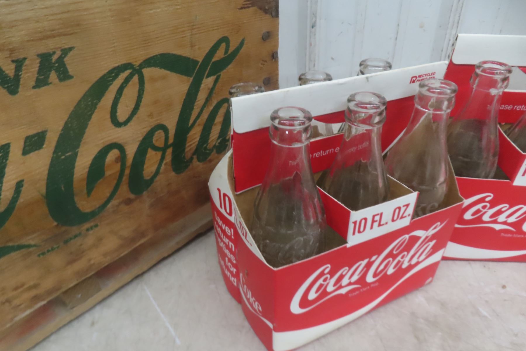 Lot 100 Wood Coke Case with (4) 6 Pack Carriers and 27 Coke Bottles