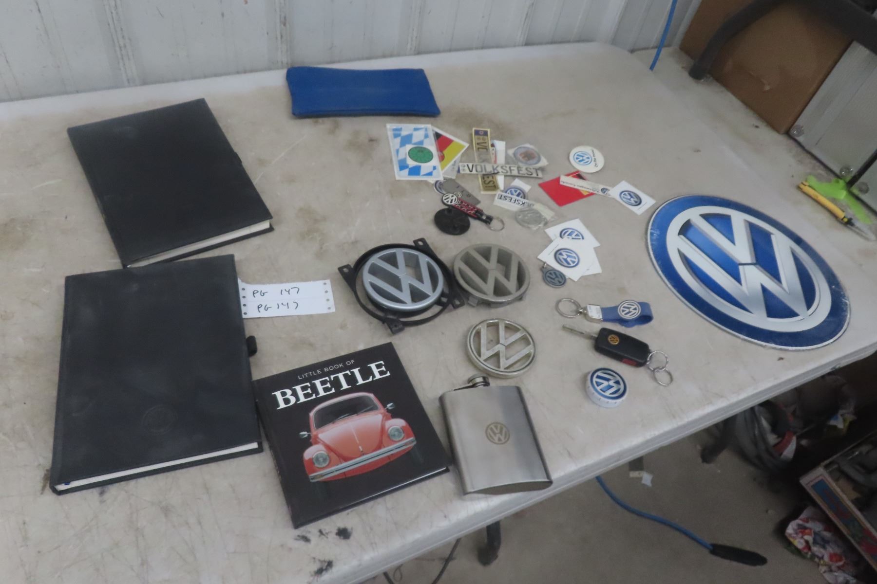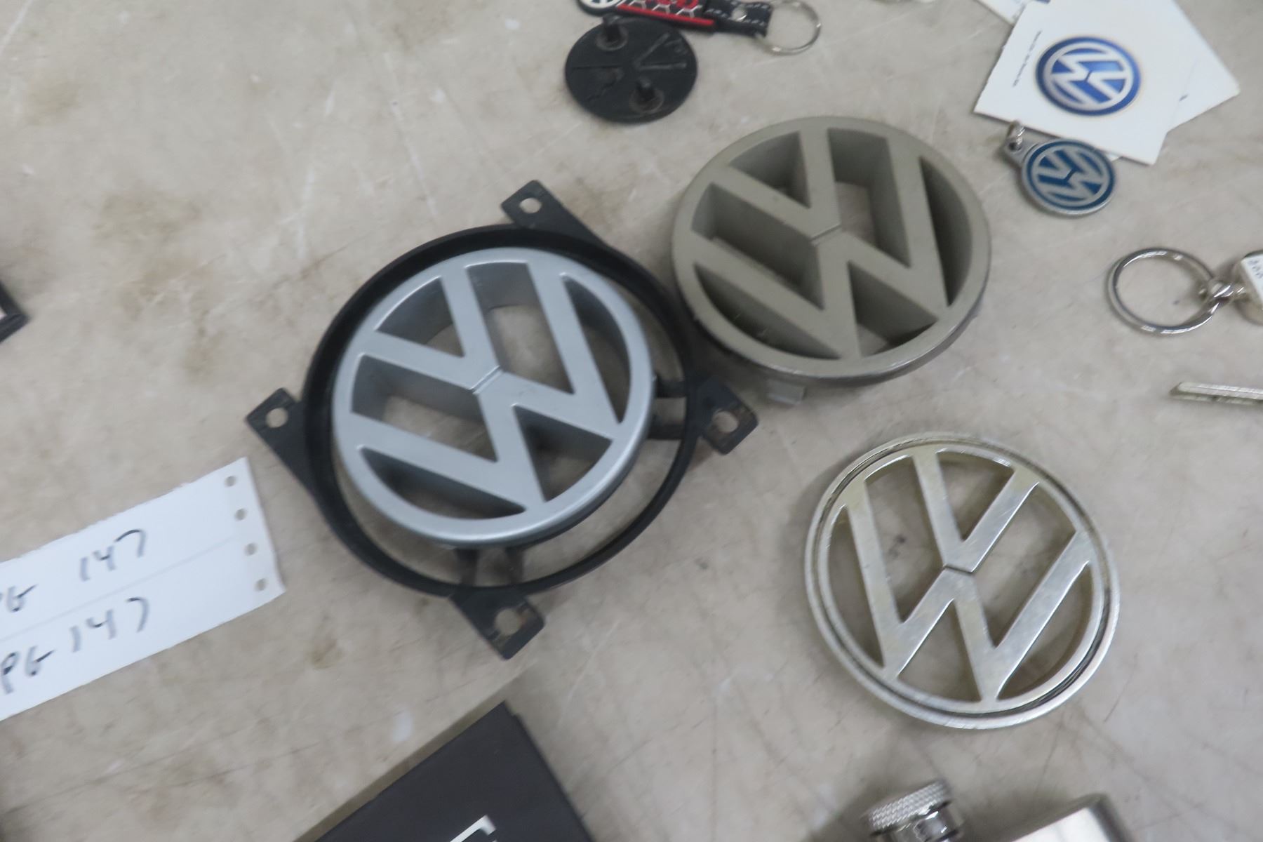 Lot 147 Volkswagen Items: Sign, Car Emblems, Book, Keychain