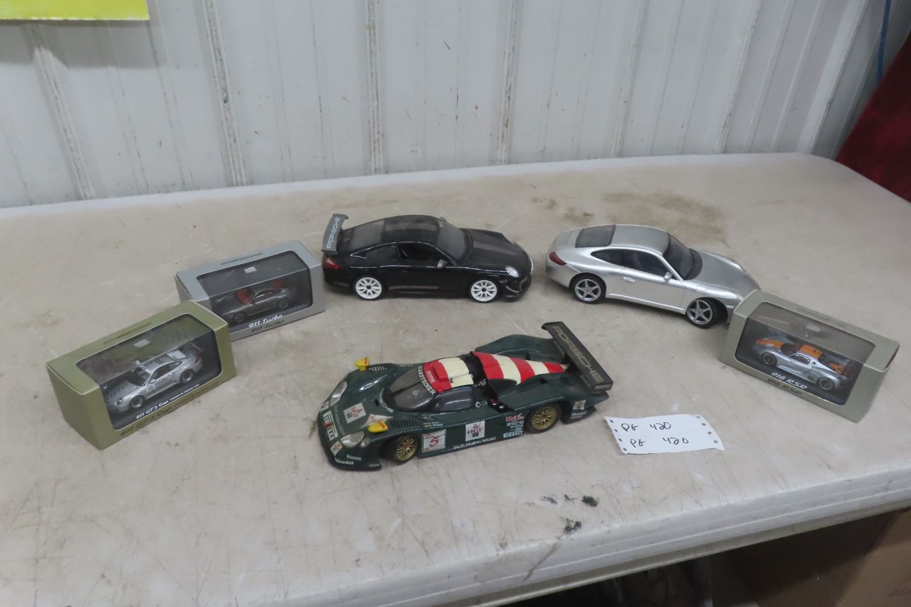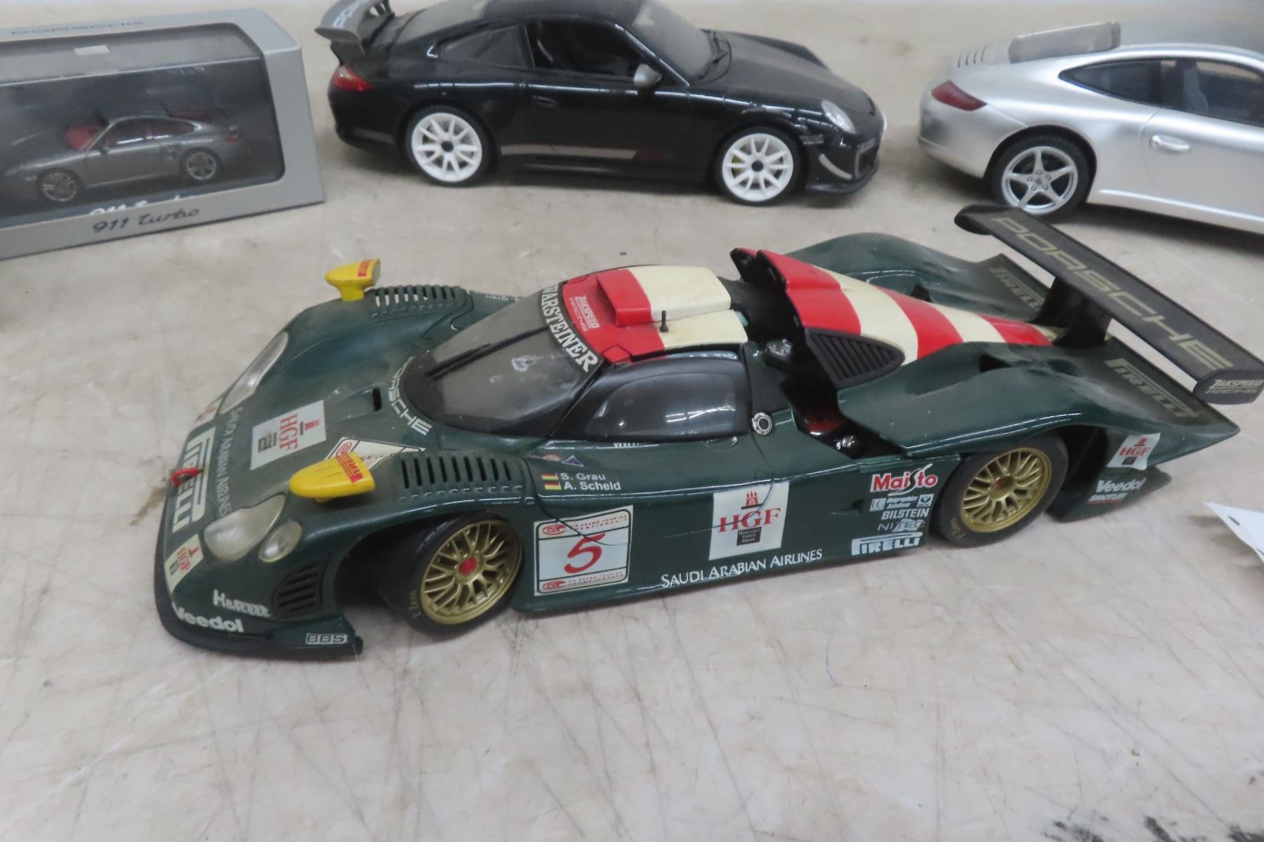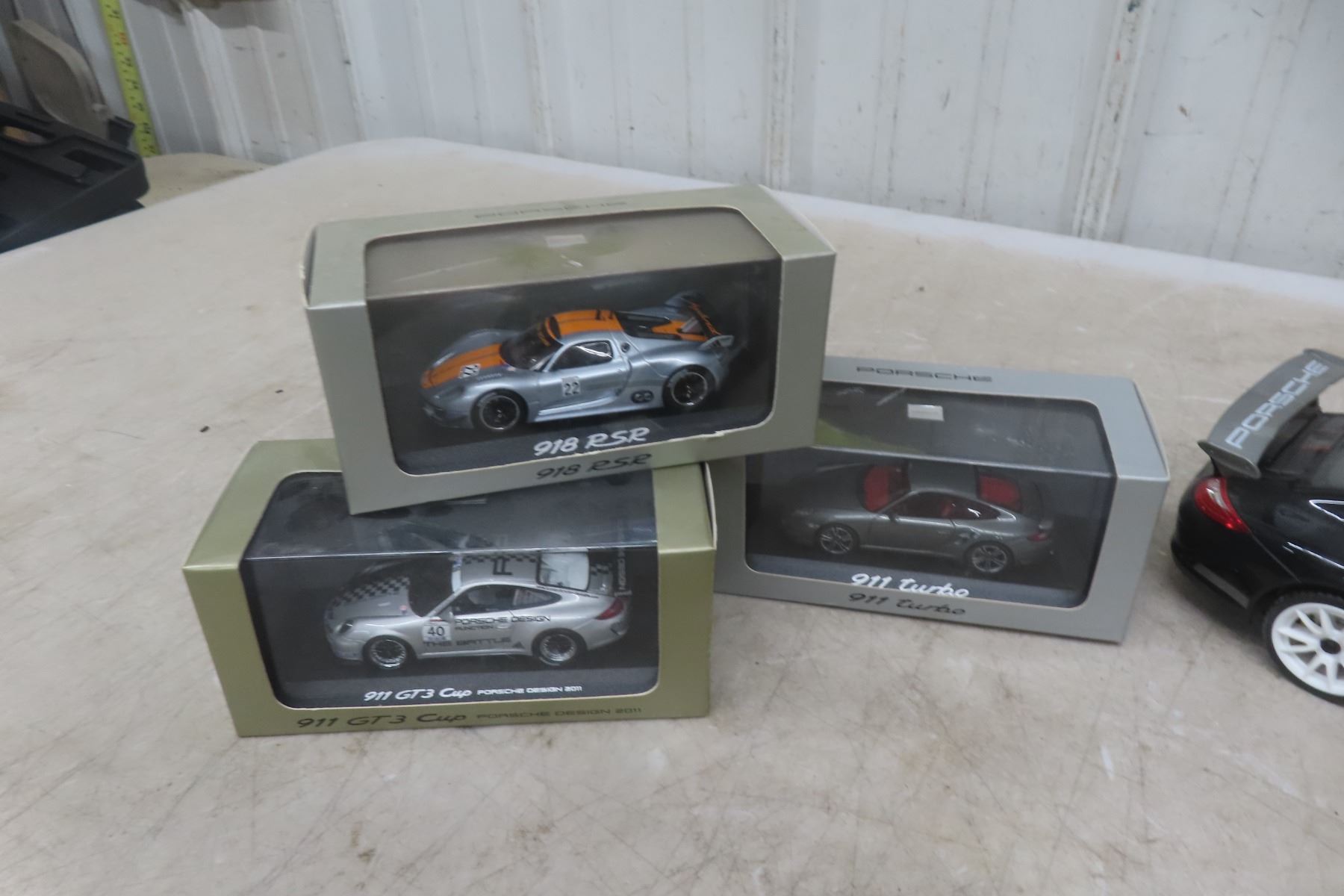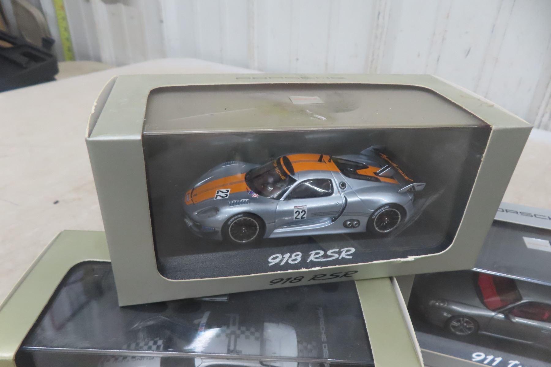 Porsche Diecast Race Car 1:18 Scale, 3 Porsche Diecast in Boxes 1:43 Scale and (2) 1:24 Scale
