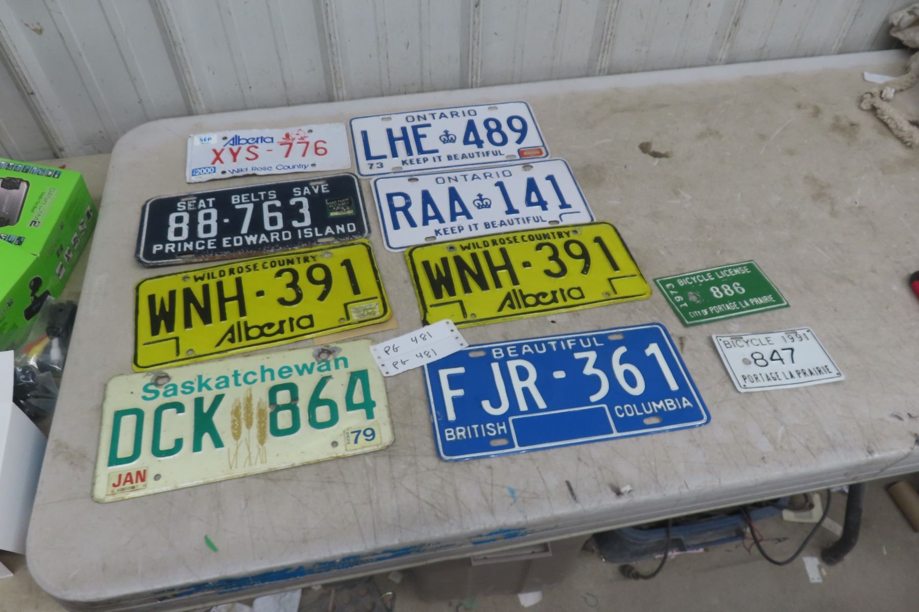 8 Various Provincial License Plates - PEI, Saskatchewan, Alberta, Ontario, BC, 2 Portage MB Bike Plates