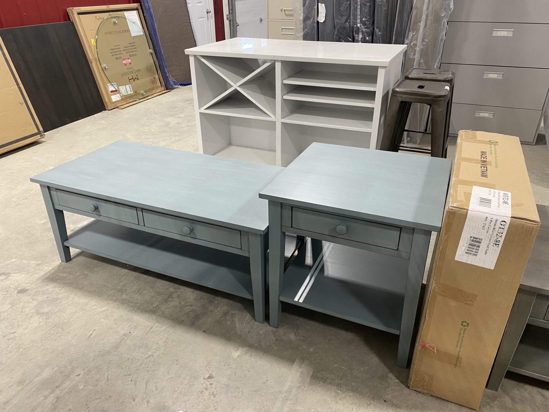 Lot 262 48 INCH MODERN COFFEE TABLE WITH 2 DRAWERS AND 2 24X24 INCH END STANDS WITH DRAWER