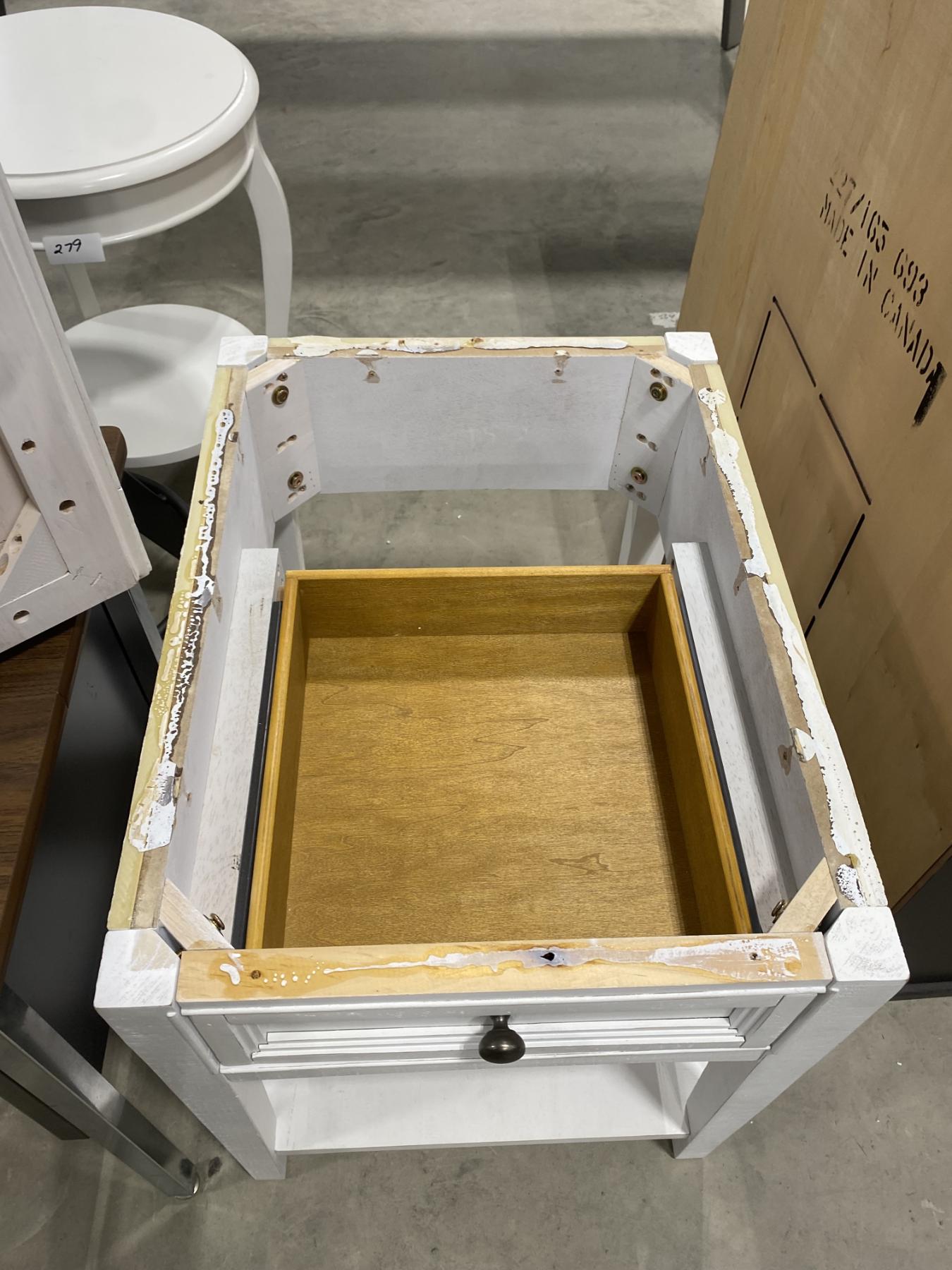 Lot 275 20 IN X 26IN END STAND WITH DRAWER- TOP JUST NEEDS GLUED TO THE BASE