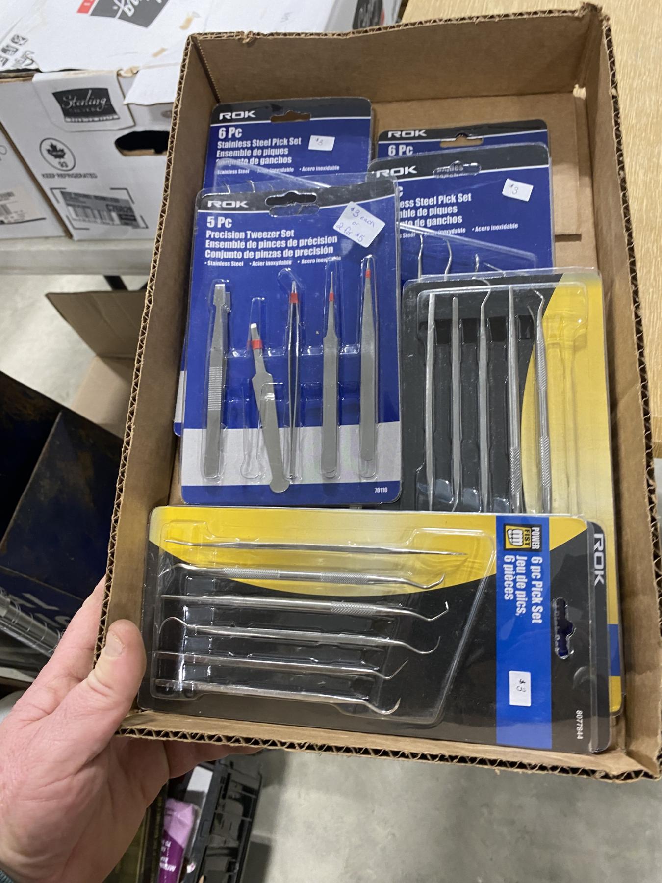 Lot 684 BOX LOT OF ASSORTED PICK SETS AND TWEEZER SETS