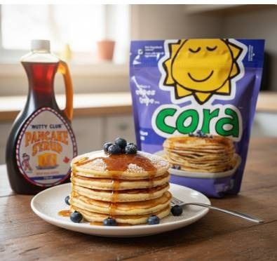 Nutty Club Pancake Syrup Bottle and Cora Pancake Mix