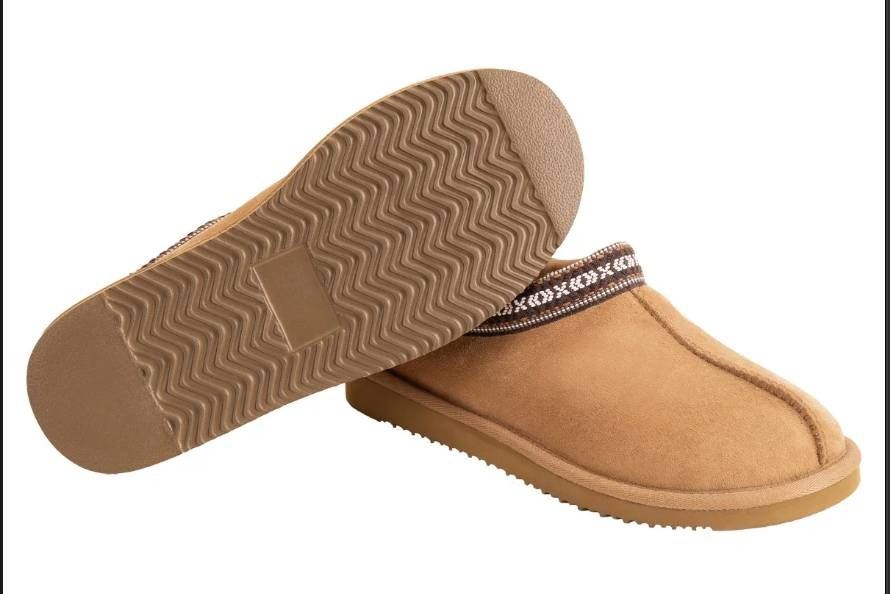 Sheepskin-Lined Slip-On Shoes, US 7 / UK 6 / EU 39, Tan with Embroidered Trim