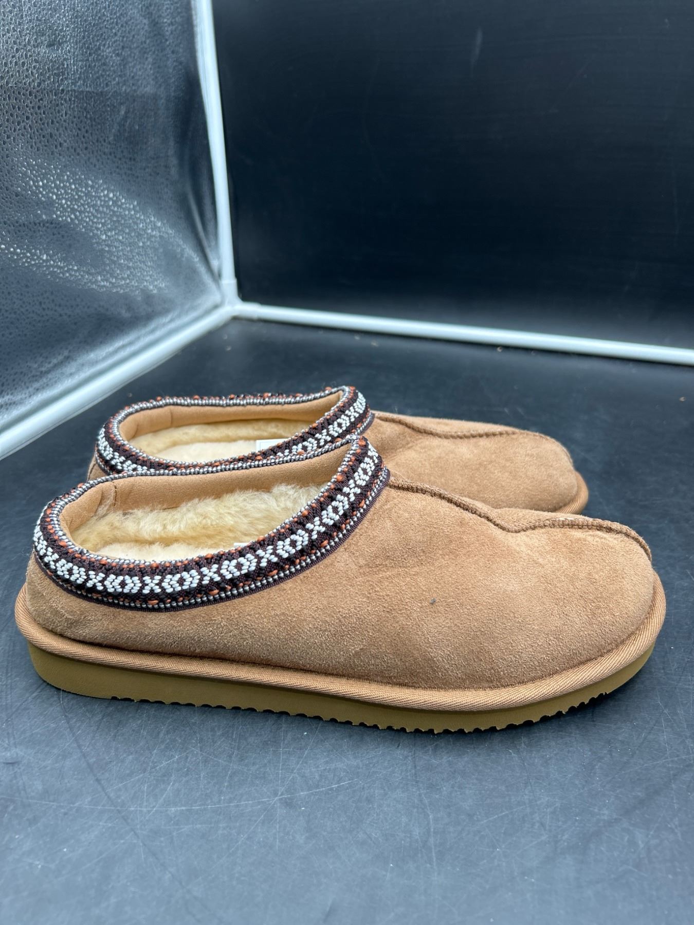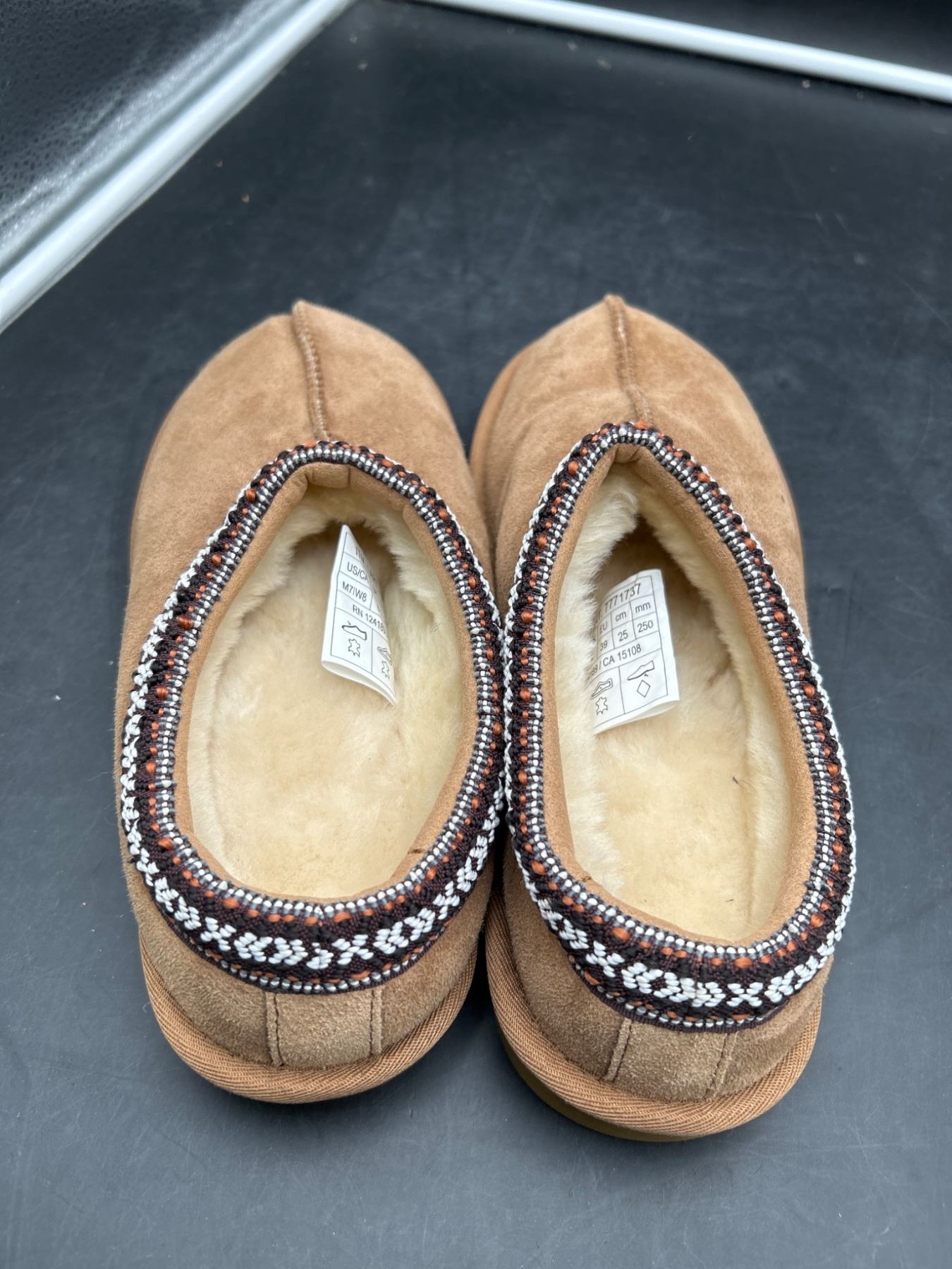 Lot 96 Sheepskin-Lined Slip-On Shoes, US 7 / UK 6 / EU 39, Tan with Embroidered Trim