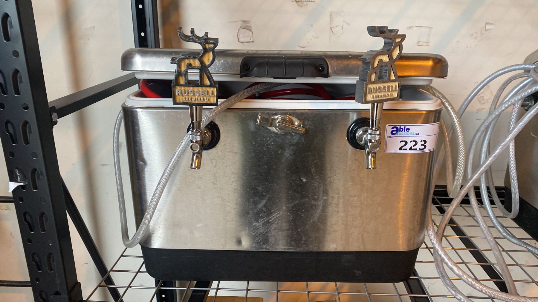 Lot 223 STAINLESS STEEL COLEMAN BEER COOLER - 2 TAP SYSTEM WITH COOLER COILS, GAUGES AND HOSE LINES