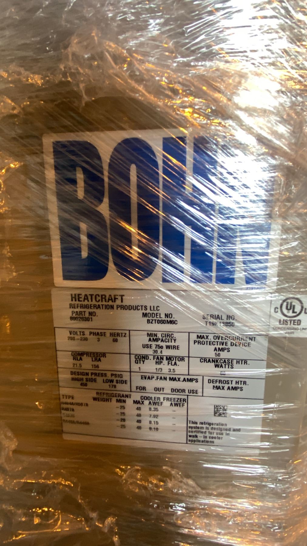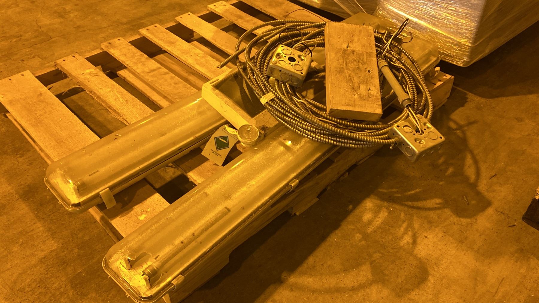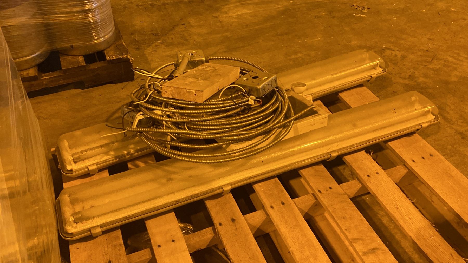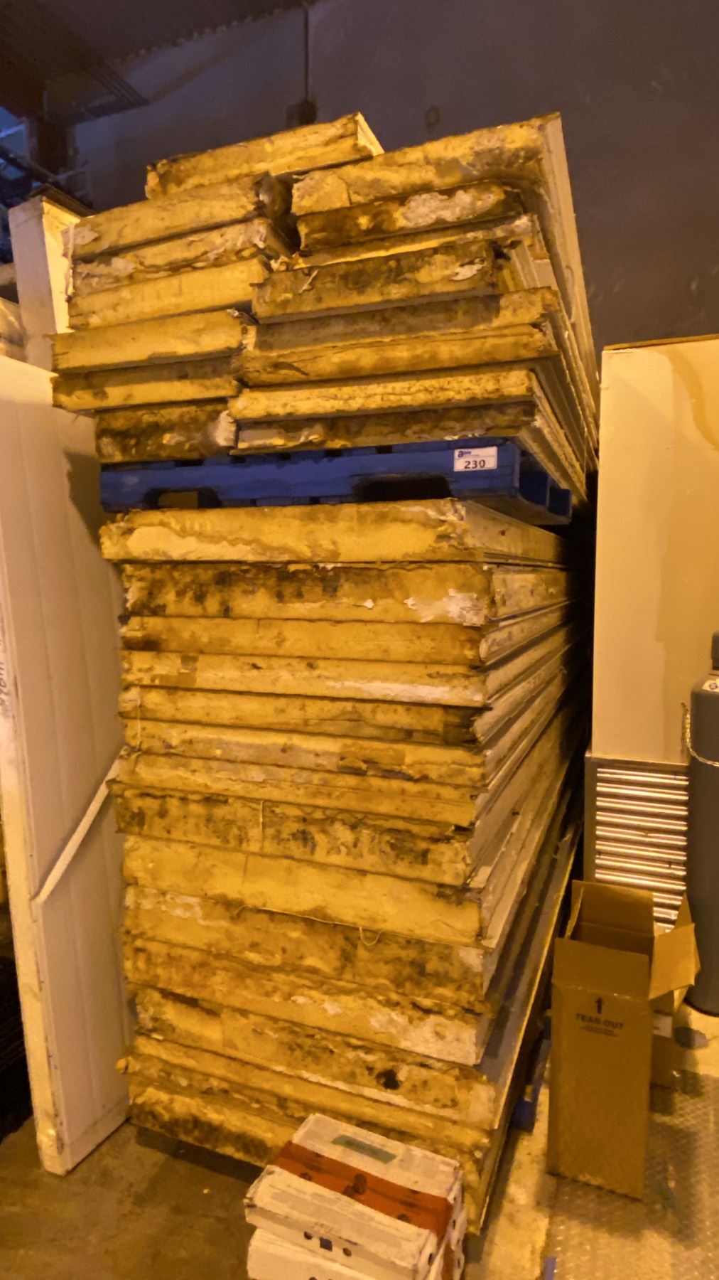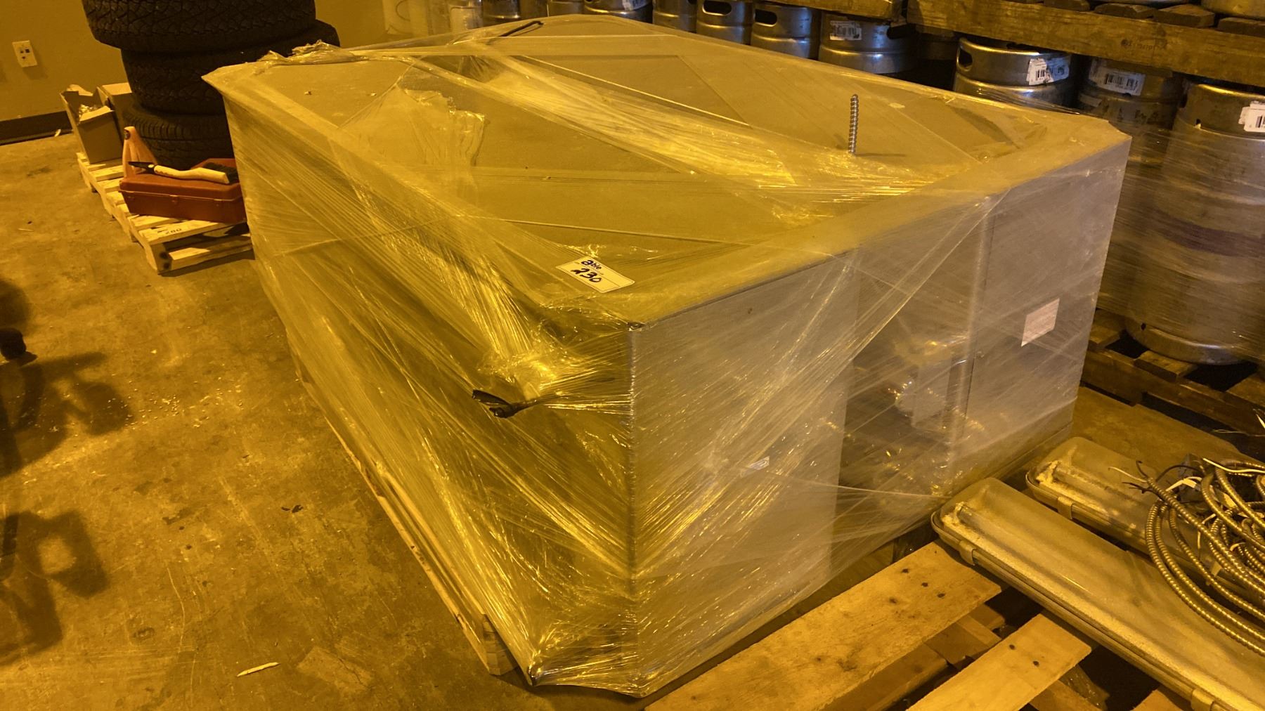 Lot 230 LARGE WALK IN COOLER WITH (4) BONN REFRIGERATION UNITS AND PALLET OF ELECTRICAL AND LIGHTS