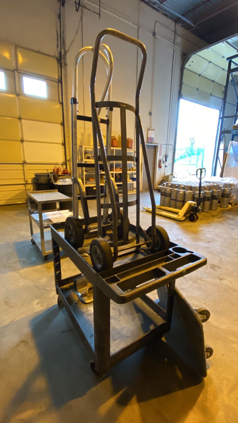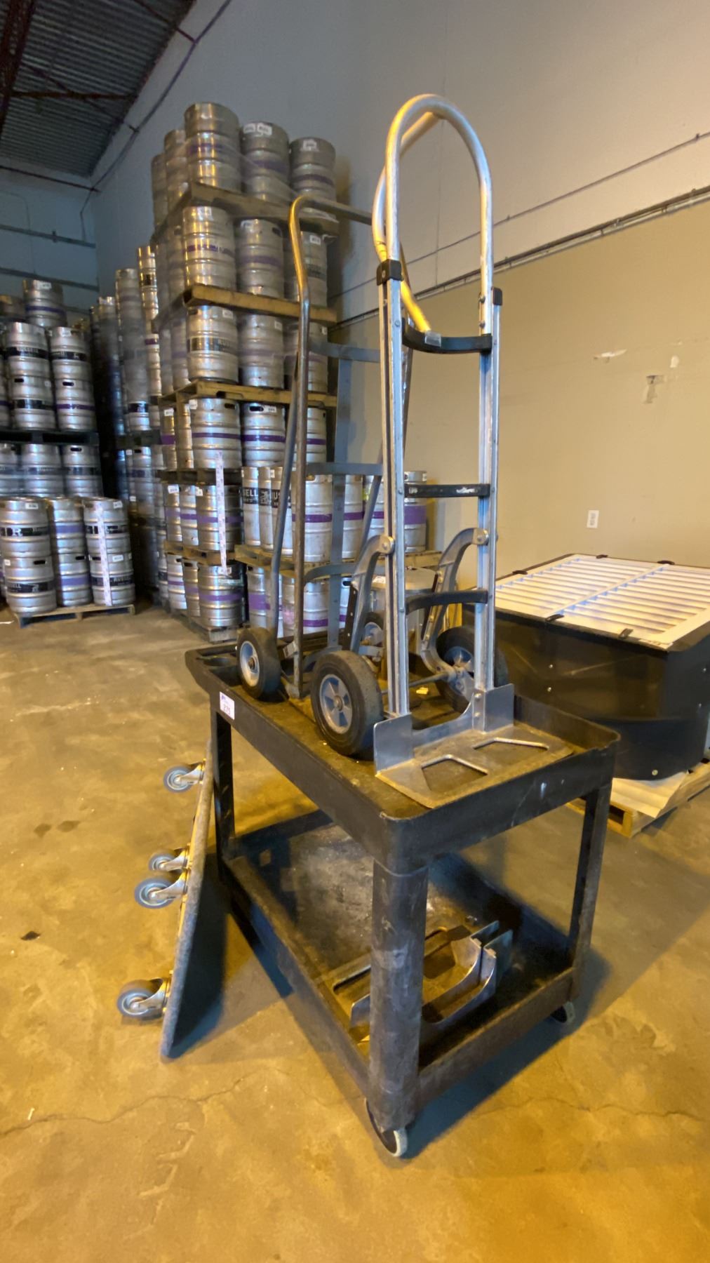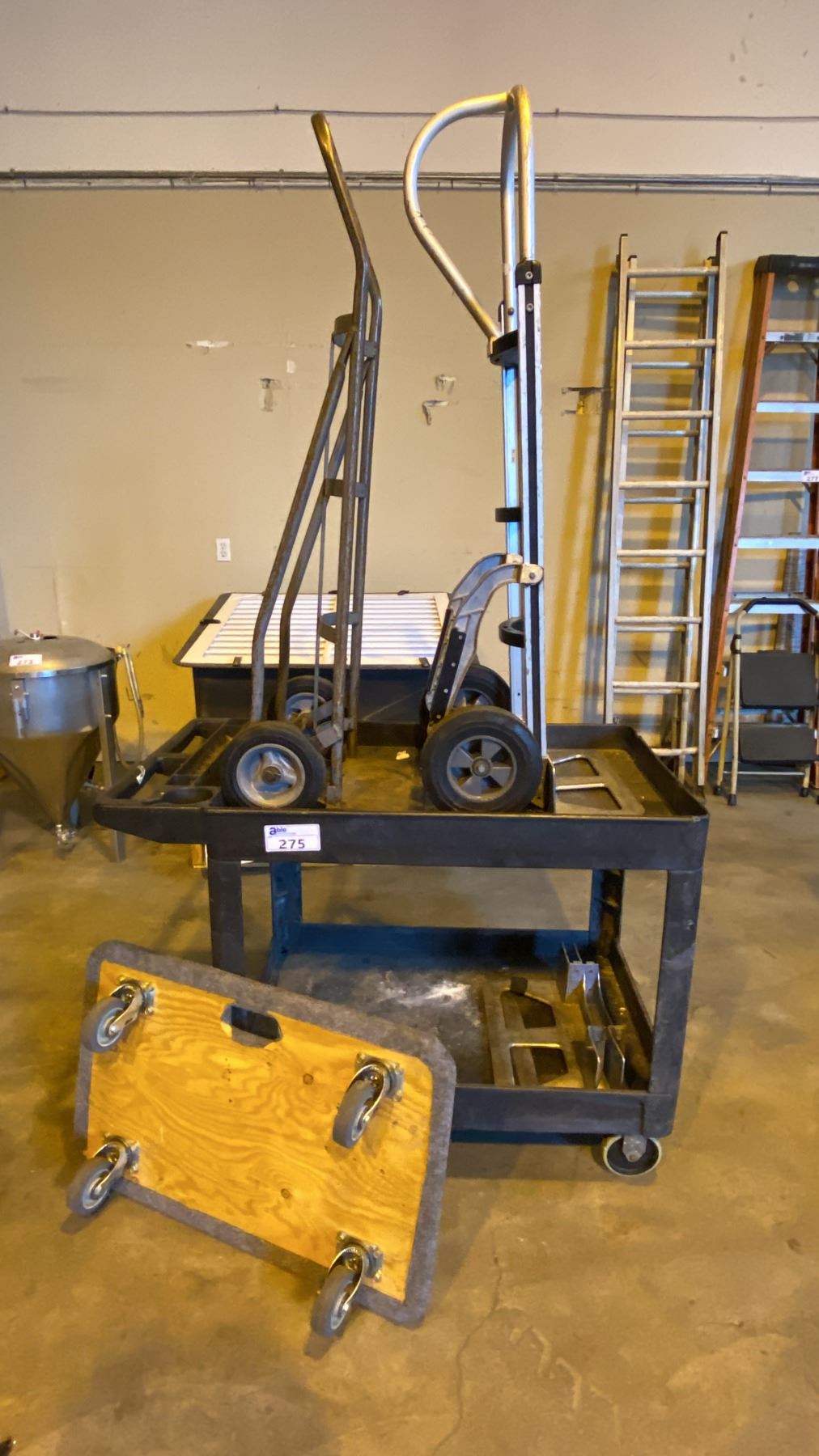 Lot 275 (2) HARD WHEEL HAND CART DOLLIES, (1) 4 WHEEL FLAT DOLLY AND (1) RUBBERMAID MOBILE WORK
