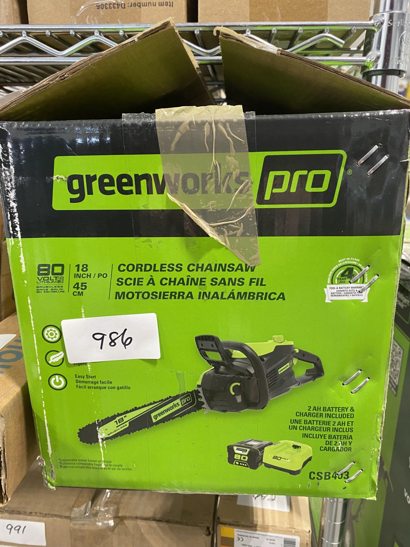 Lot 986 GREENWORKS 18 INCH, 80V CHAIN SAW