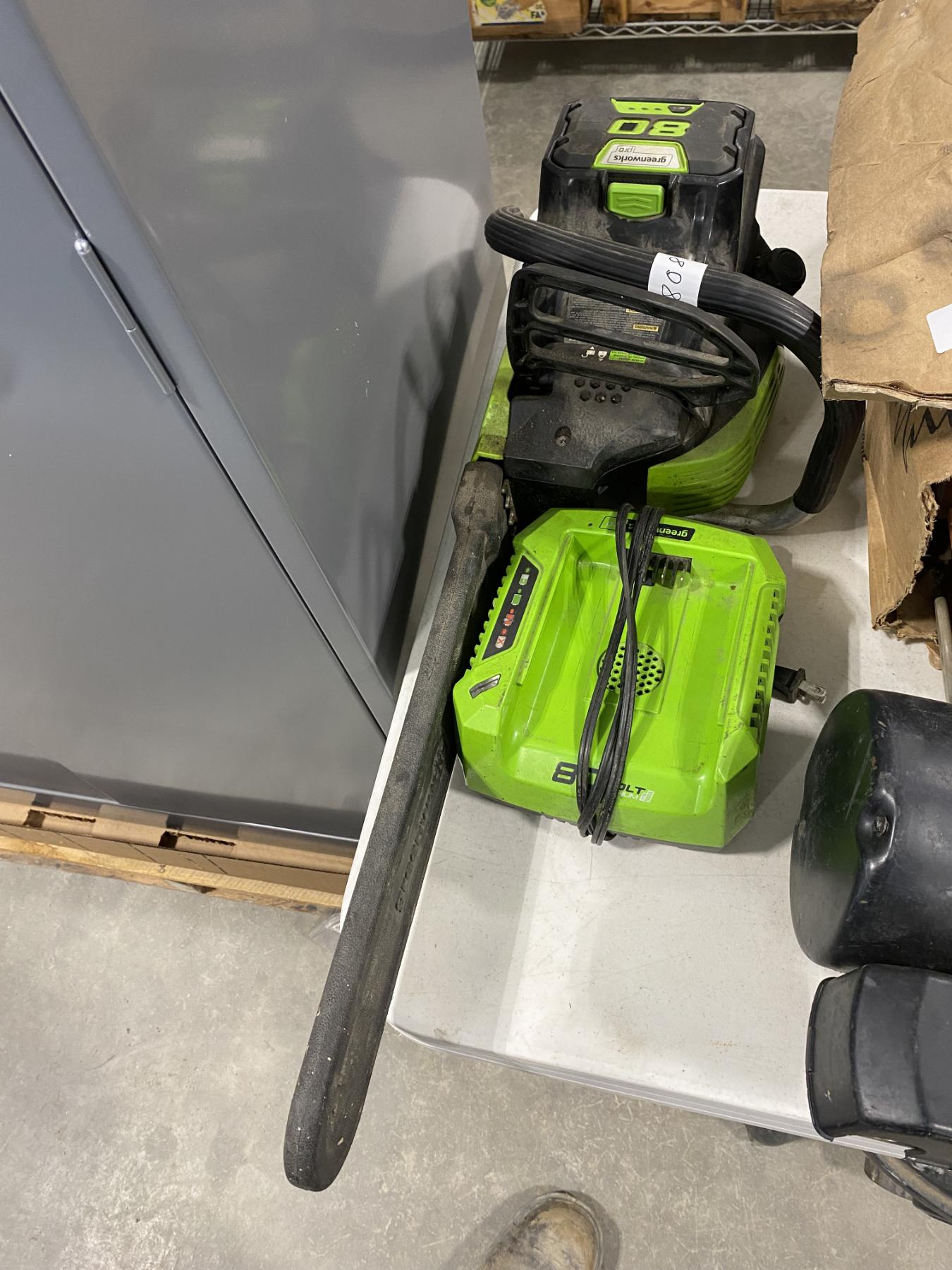 Lot 808 GREENWORKS ELECTRIC CHAINSAW WITH BATTERY AND CHARGER