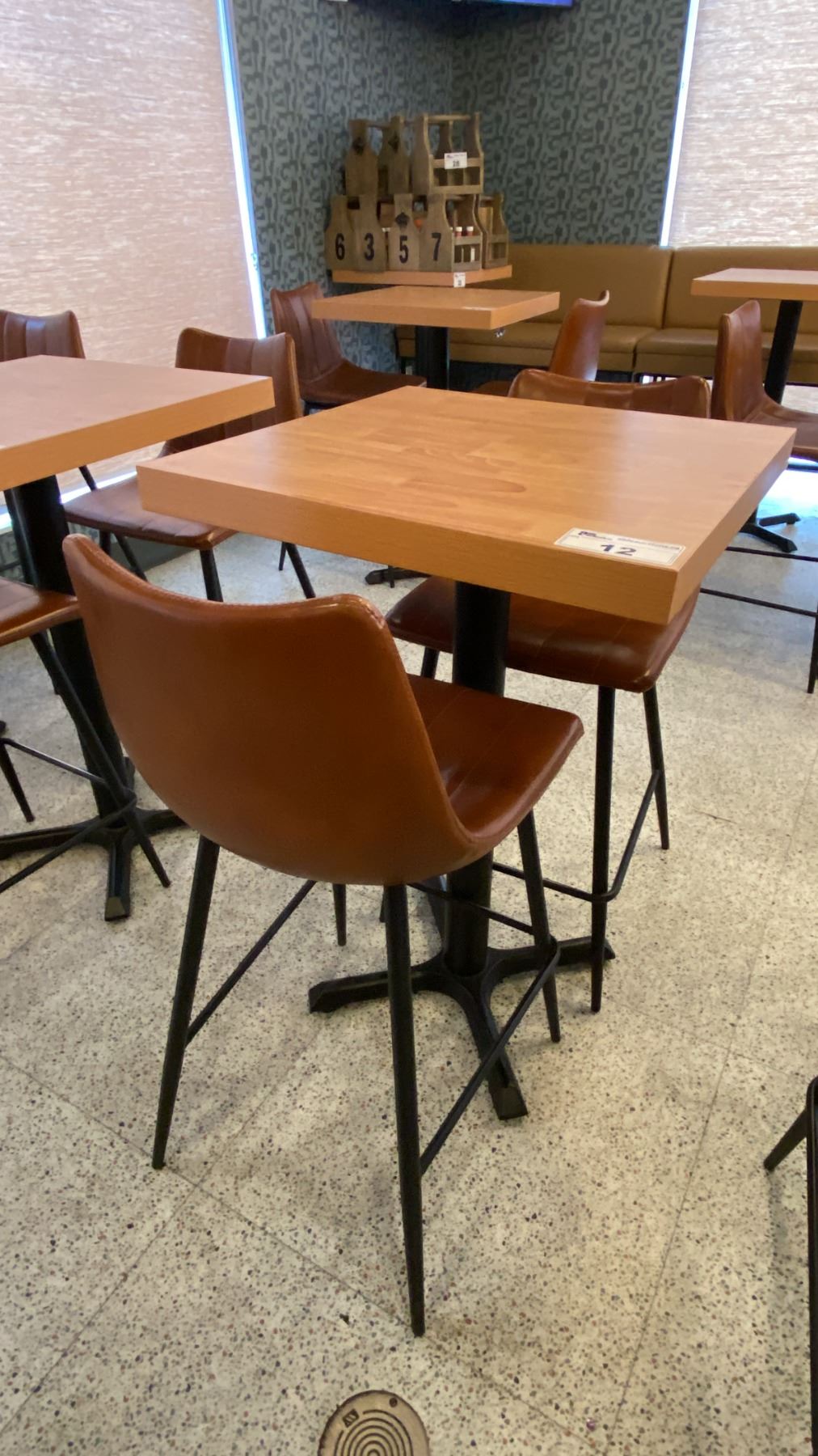 Lot 12 SMALL COUNTER HEIGHT BAR/BISTRO TABLE WITH 2 BROWN LEATHER UPHOLSTERED CHAIRS -