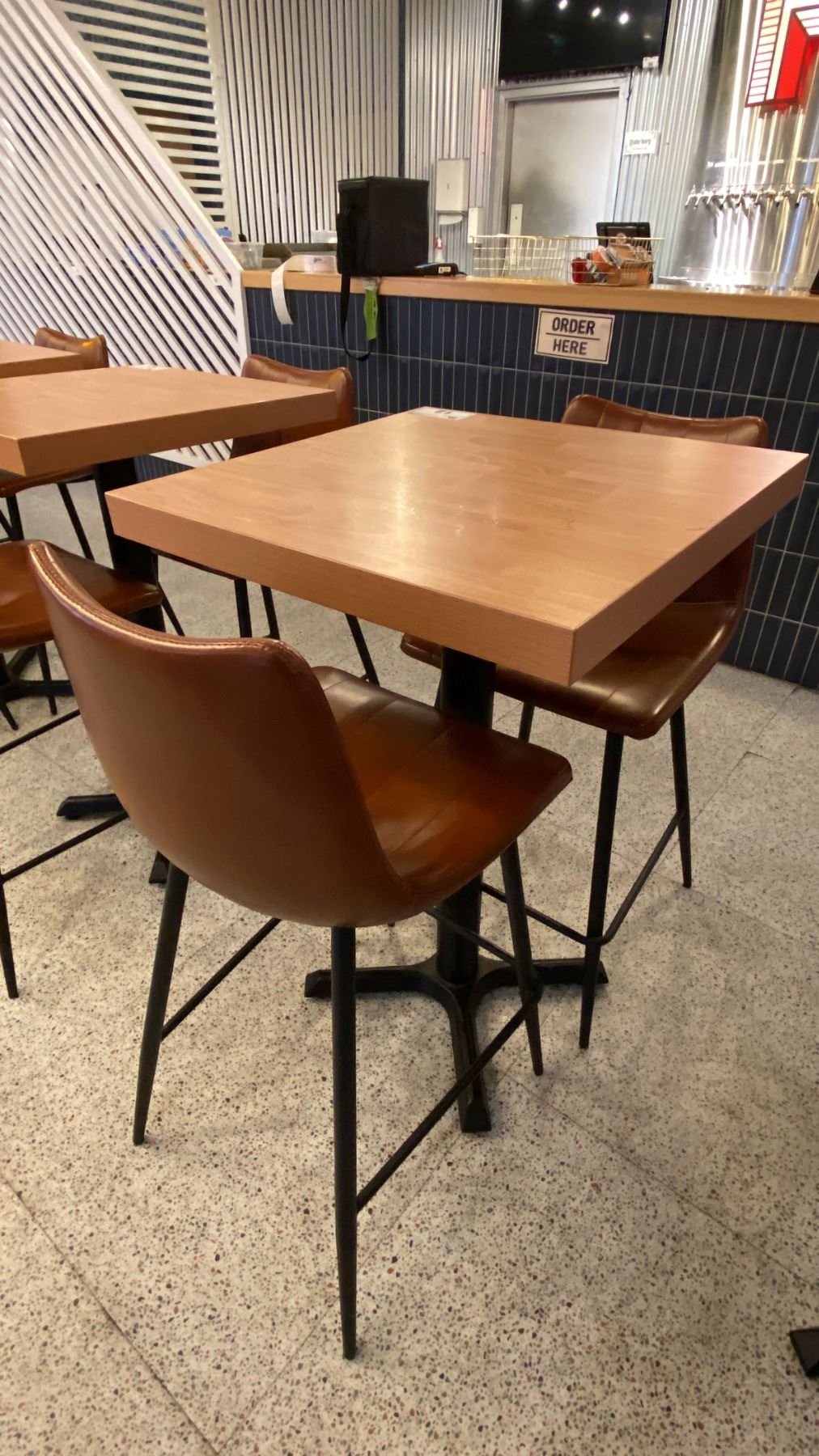 SMALL COUNTER HEIGHT BAR/BISTRO TABLE WITH 2 BROWN LEATHER UPHOLSTERED CHAIRS - APPROX. 2FT X 2FT X 3FT HIGH