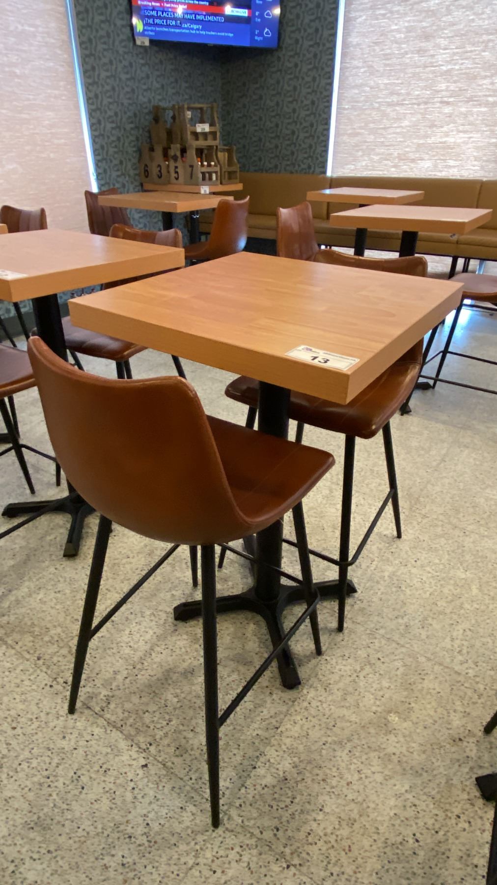 Lot 13 SMALL COUNTER HEIGHT BAR/BISTRO TABLE WITH 2 BROWN LEATHER UPHOLSTERED CHAIRS -