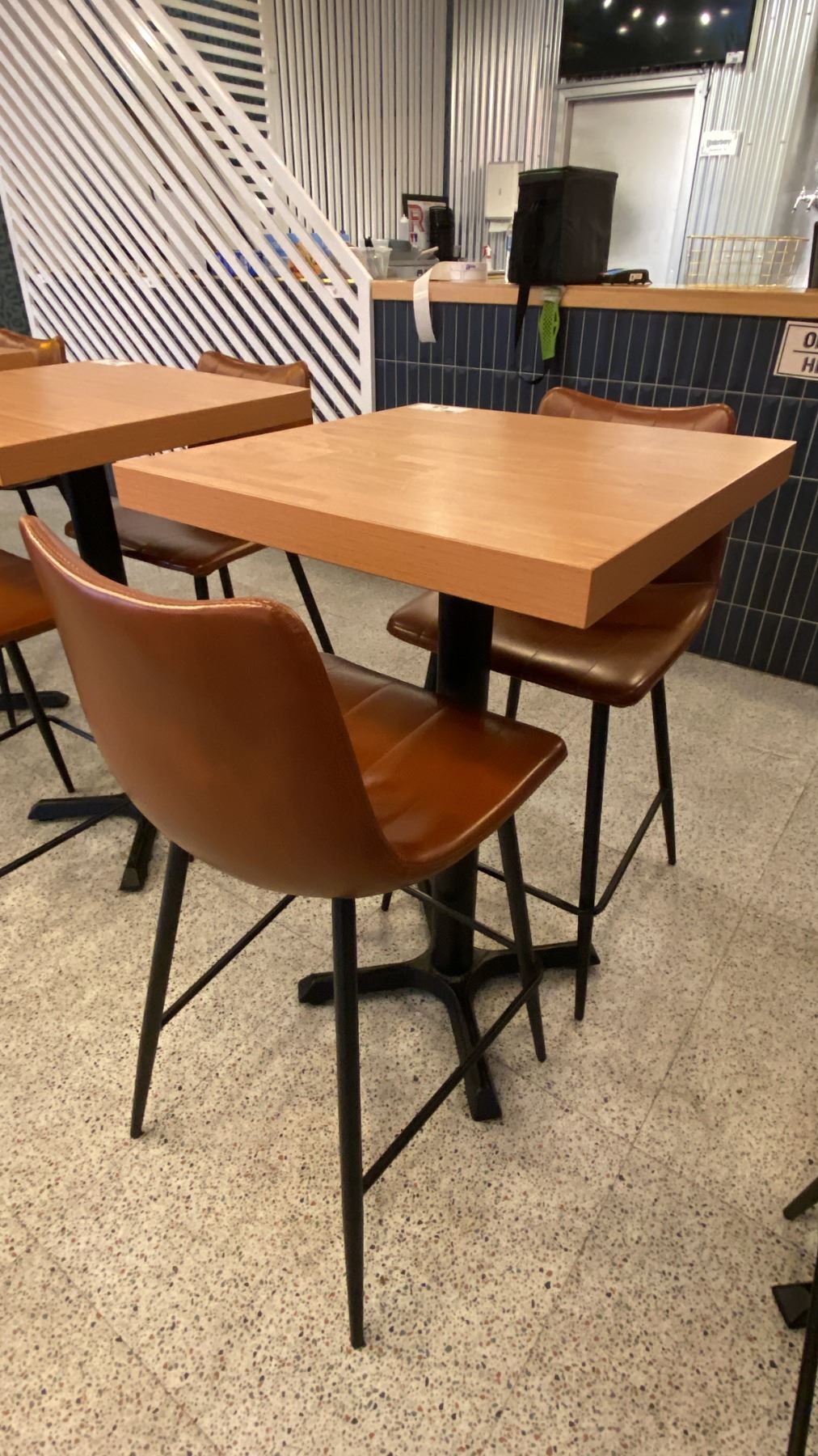 SMALL COUNTER HEIGHT BAR/BISTRO TABLE WITH 2 BROWN LEATHER UPHOLSTERED CHAIRS - APPROX. 2FT X 2FT X 3FT HIGH