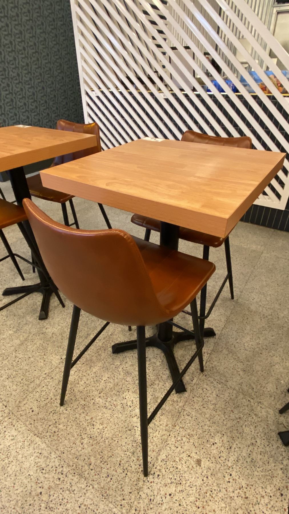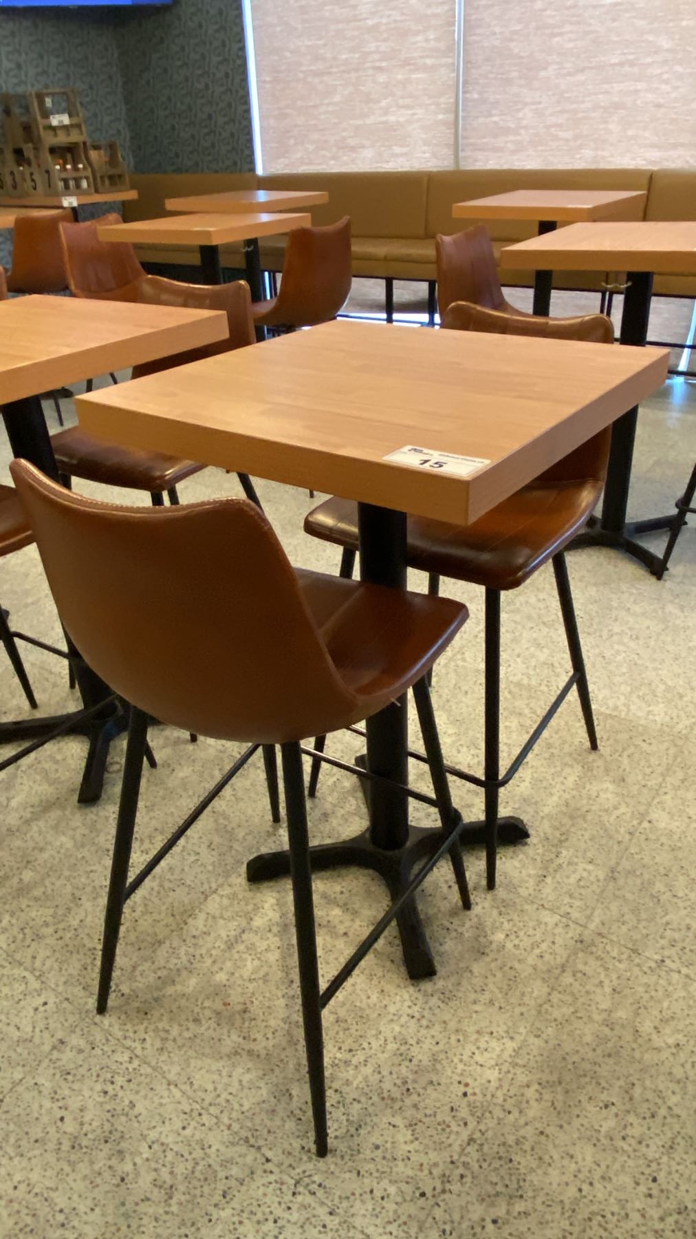 SMALL COUNTER HEIGHT BAR/BISTRO TABLE WITH 2 BROWN LEATHER UPHOLSTERED CHAIRS - APPROX. 2FT X 2FT X 3FT HIGH