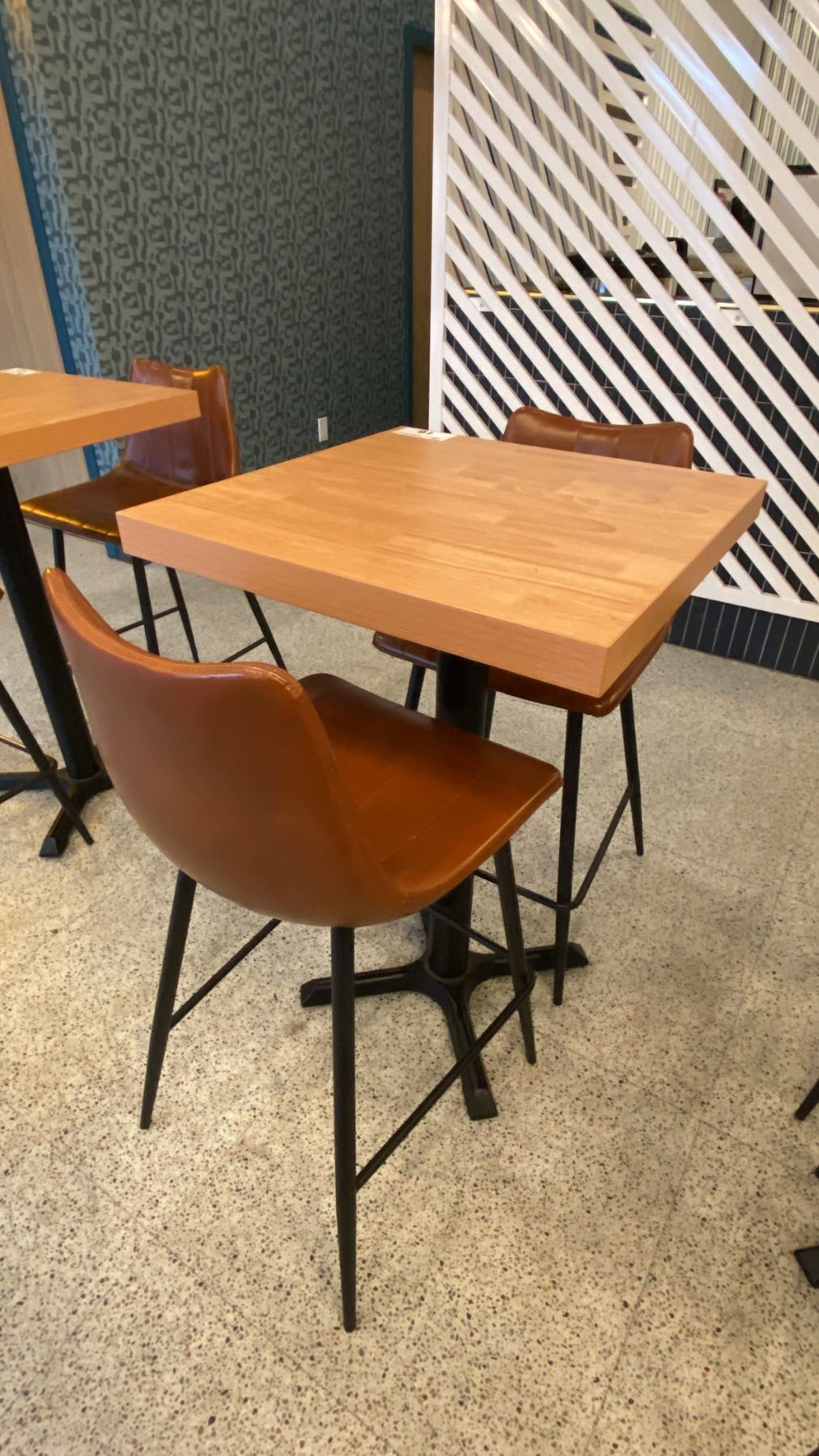 SMALL COUNTER HEIGHT BAR/BISTRO TABLE WITH 2 BROWN LEATHER UPHOLSTERED CHAIRS - APPROX. 2FT X 2FT X 3FT HIGH