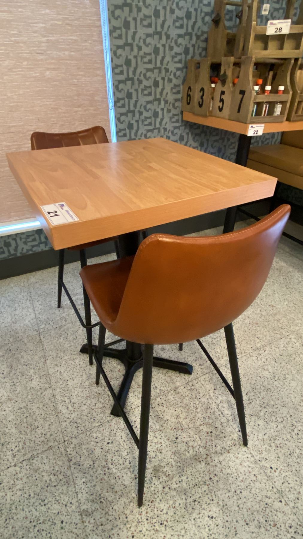 Lot 21 SMALL COUNTER HEIGHT BAR/BISTRO TABLE WITH 2 BROWN LEATHER UPHOLSTERED CHAIRS -