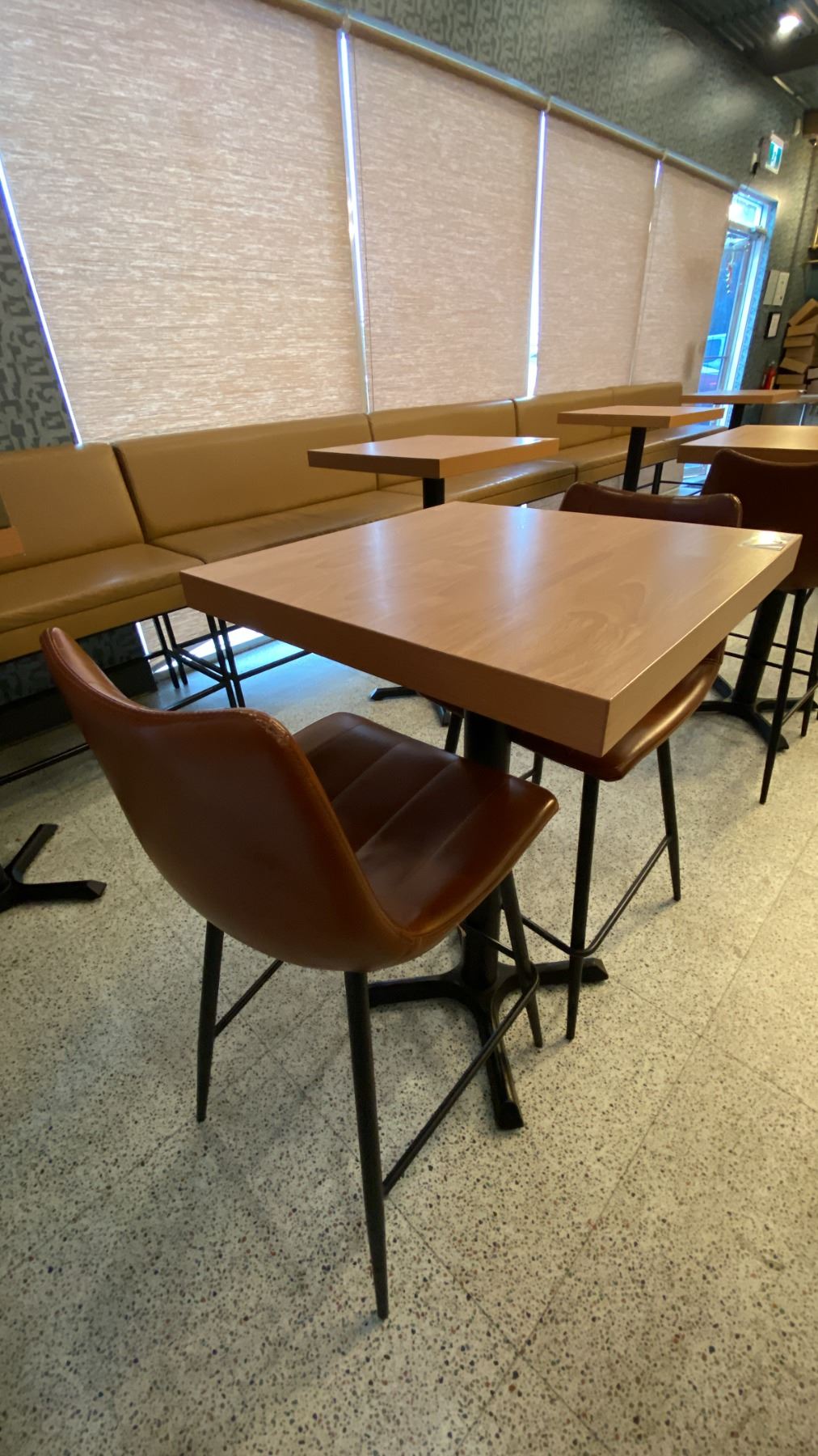SMALL COUNTER HEIGHT BAR/BISTRO TABLE WITH 2 BROWN LEATHER UPHOLSTERED CHAIRS - APPROX. 2FT X 2FT X 3FT HIGH