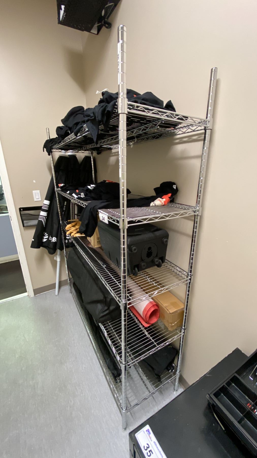 Lot 34 5 TIER METAL SHELF UNIT AND CONTENTS