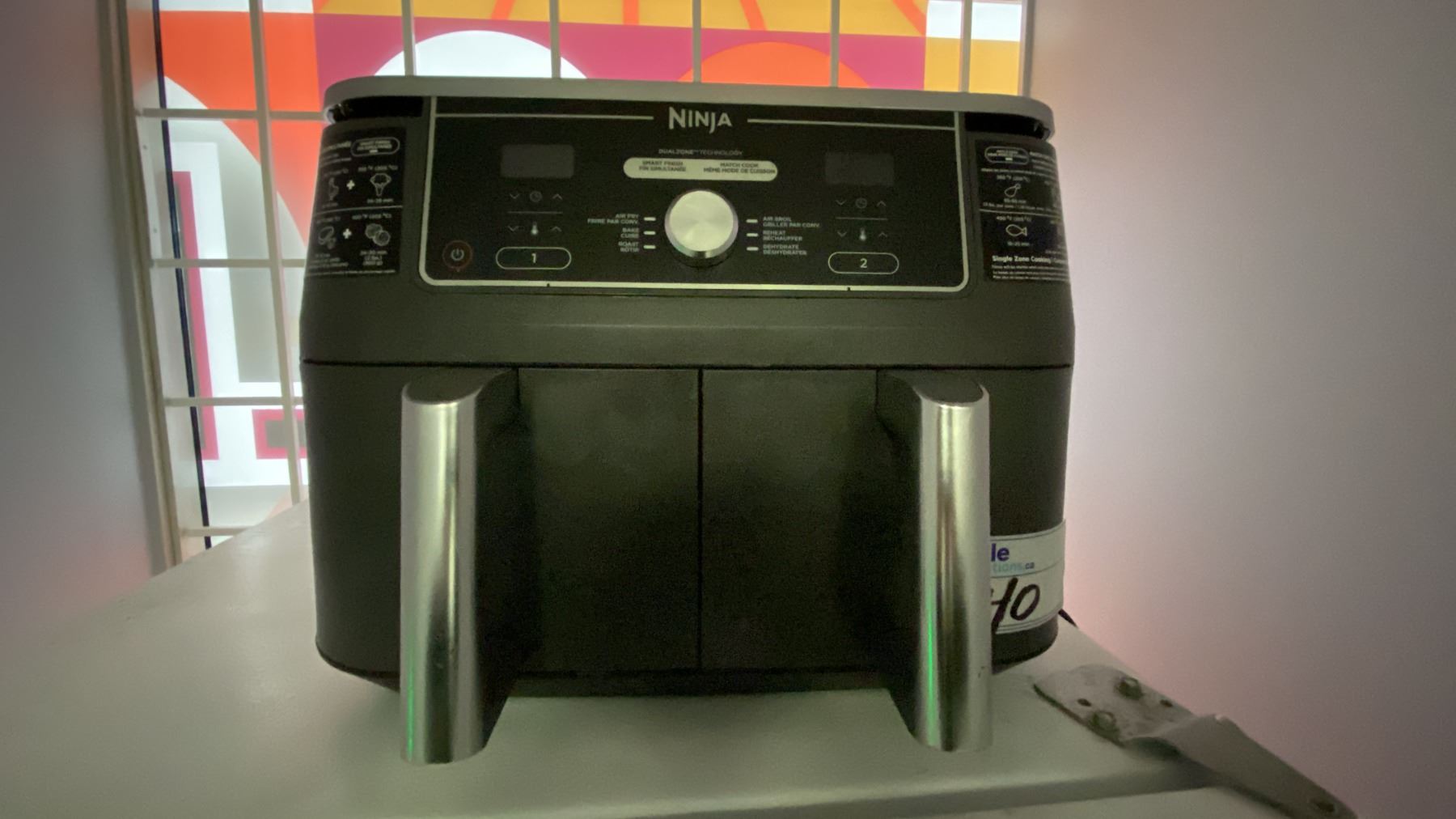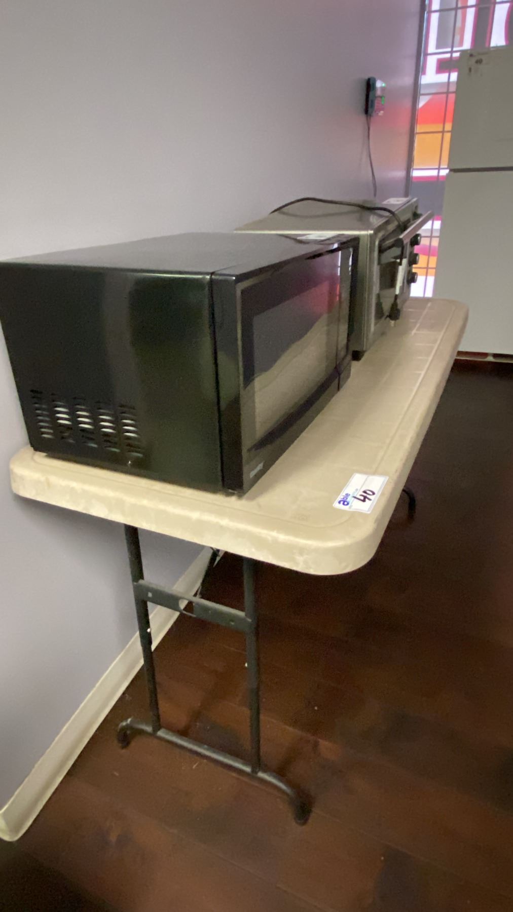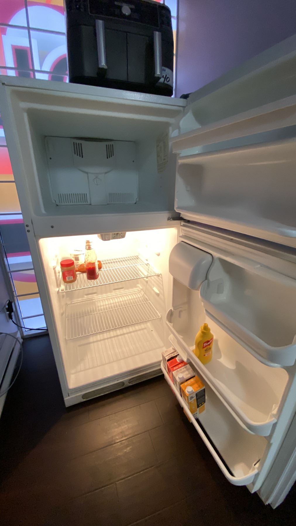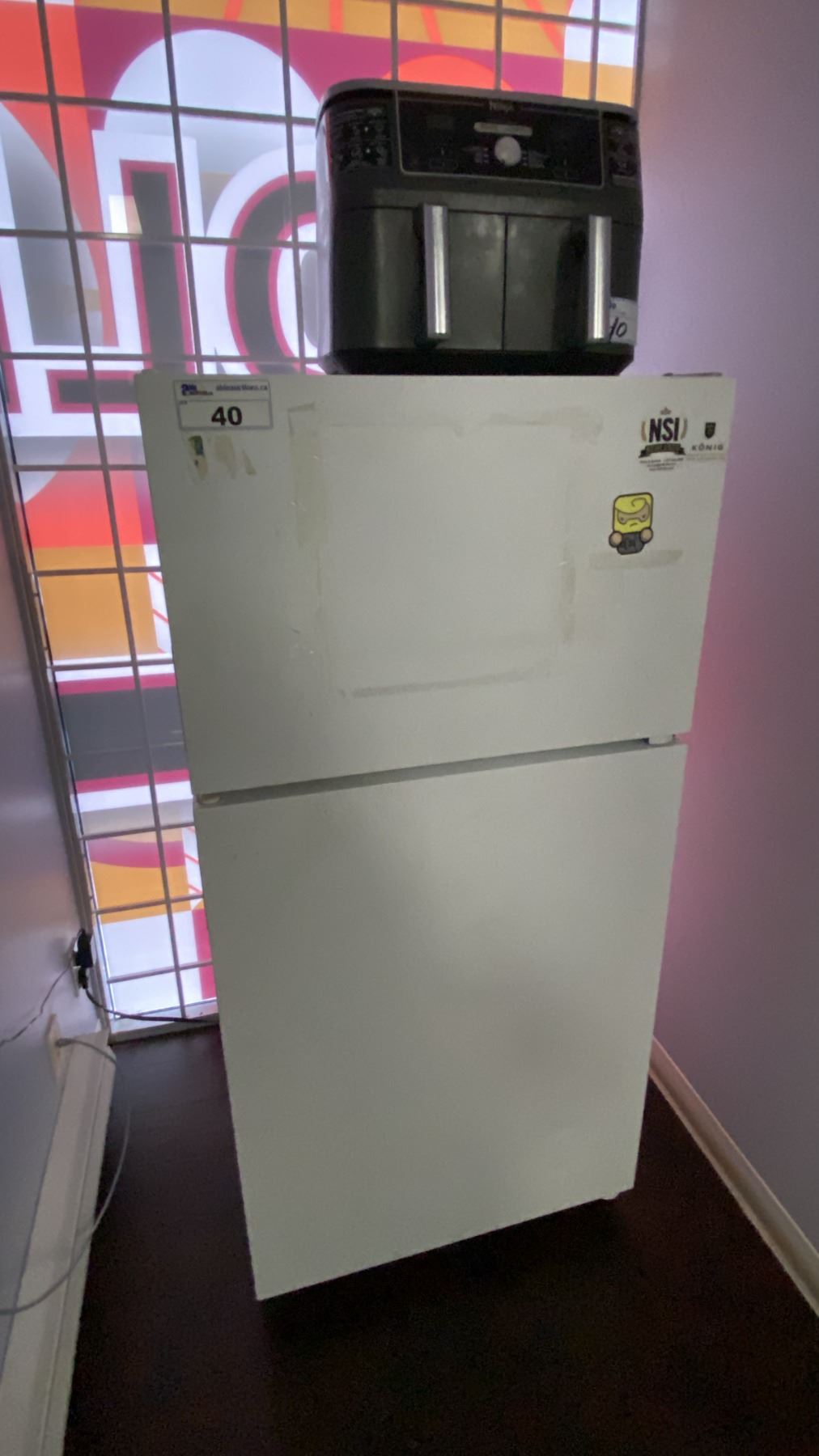 WHITE 2 DOOR FRIDGE, BLACK DANBY MICROWAVE, STAINLESS STEEL KITCHENAID TOASTER OVEN, BLACK NINJA AIR FRYER, KEURIG COFFEE MAKER, 2 SLICE TOASTER AND SMALL FOLDING TABLE