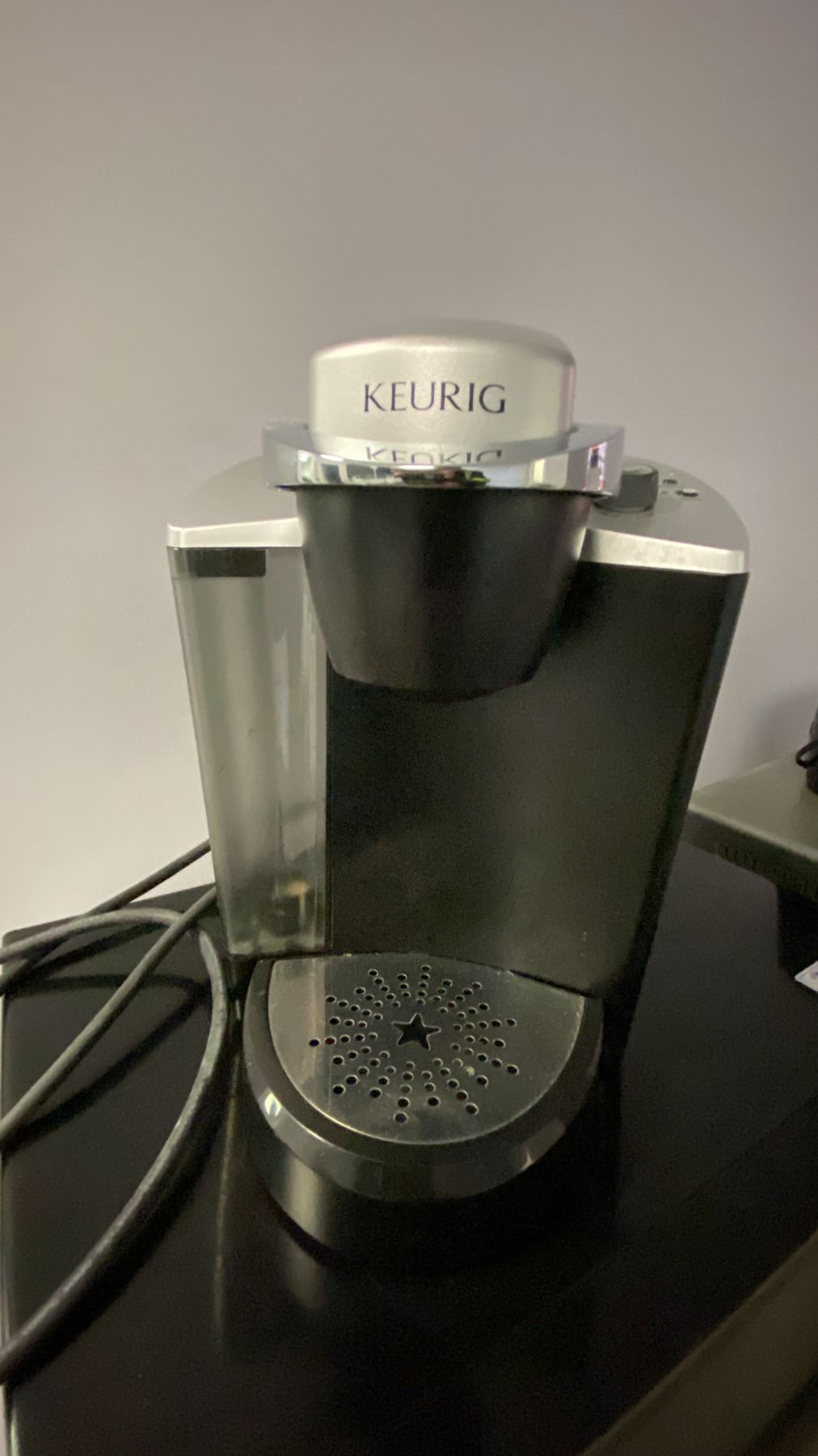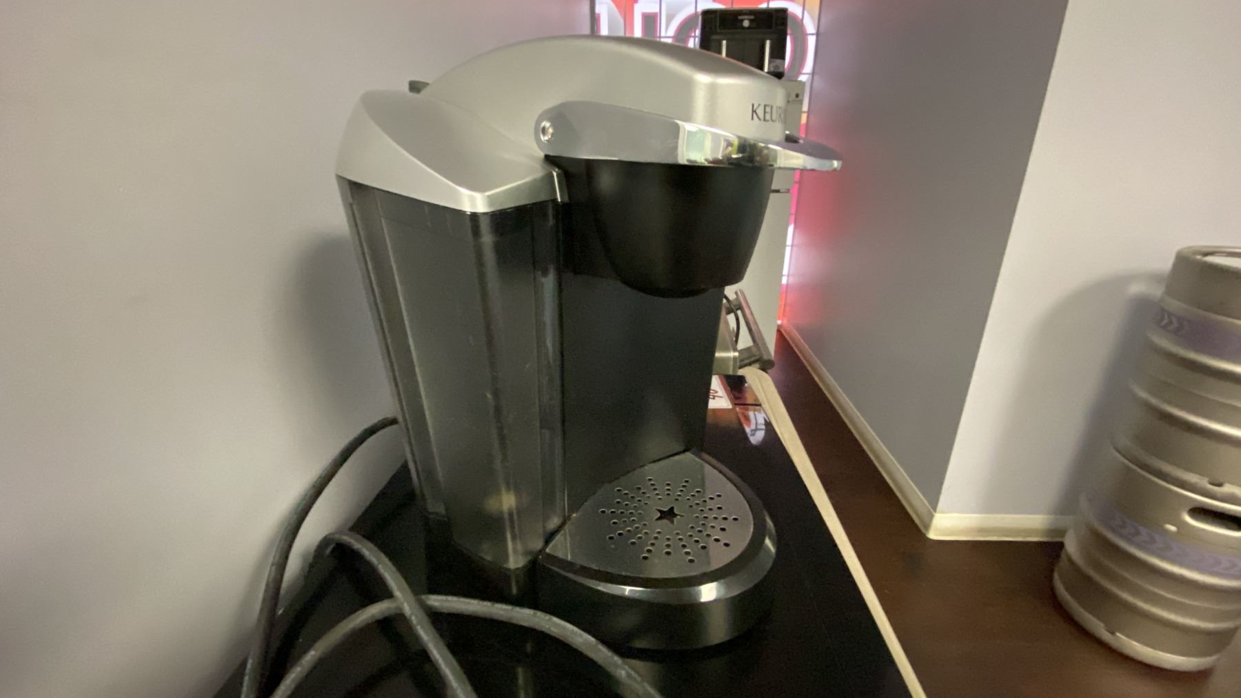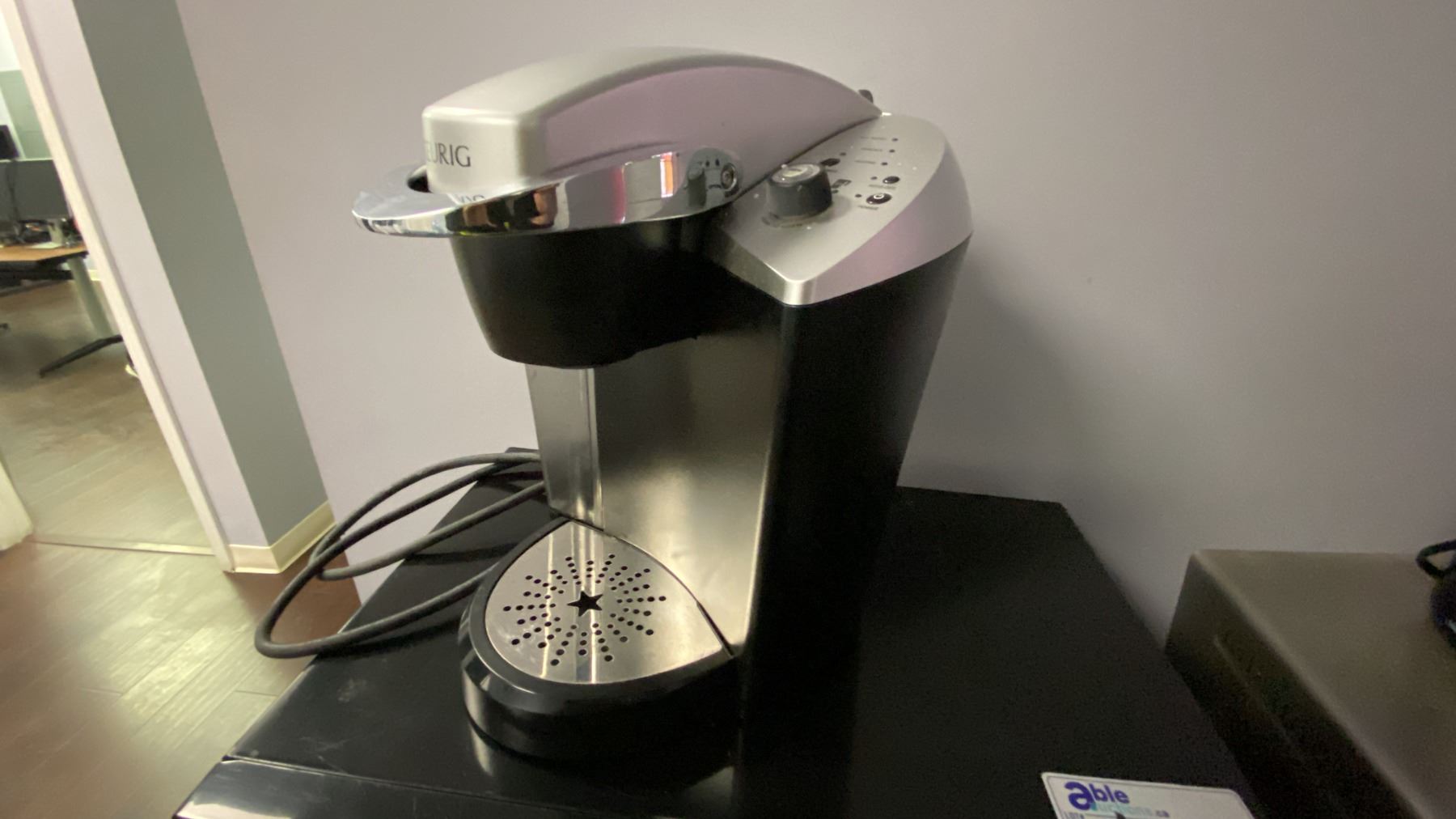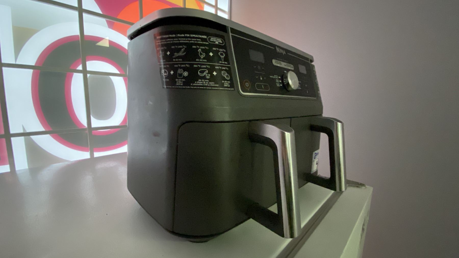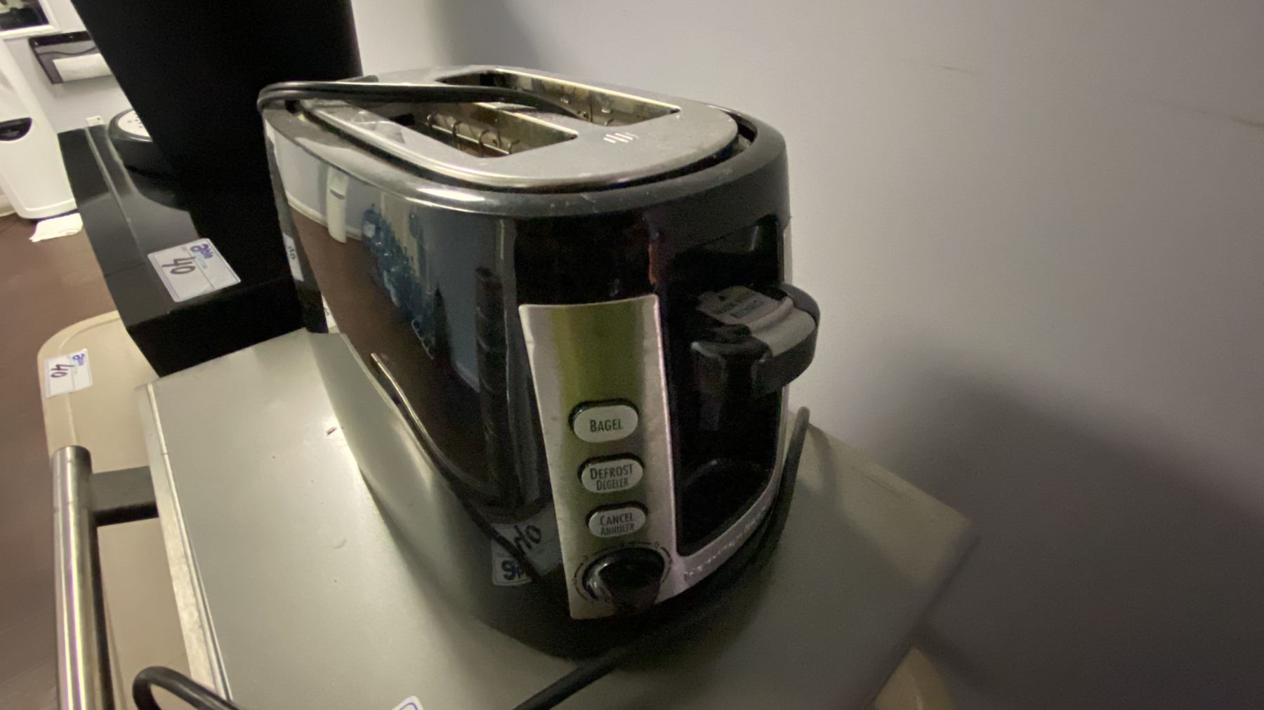 WHITE 2 DOOR FRIDGE, BLACK DANBY MICROWAVE, STAINLESS STEEL KITCHENAID TOASTER OVEN, BLACK NINJA AIR FRYER, KEURIG COFFEE MAKER, 2 SLICE TOASTER AND SMALL FOLDING TABLE