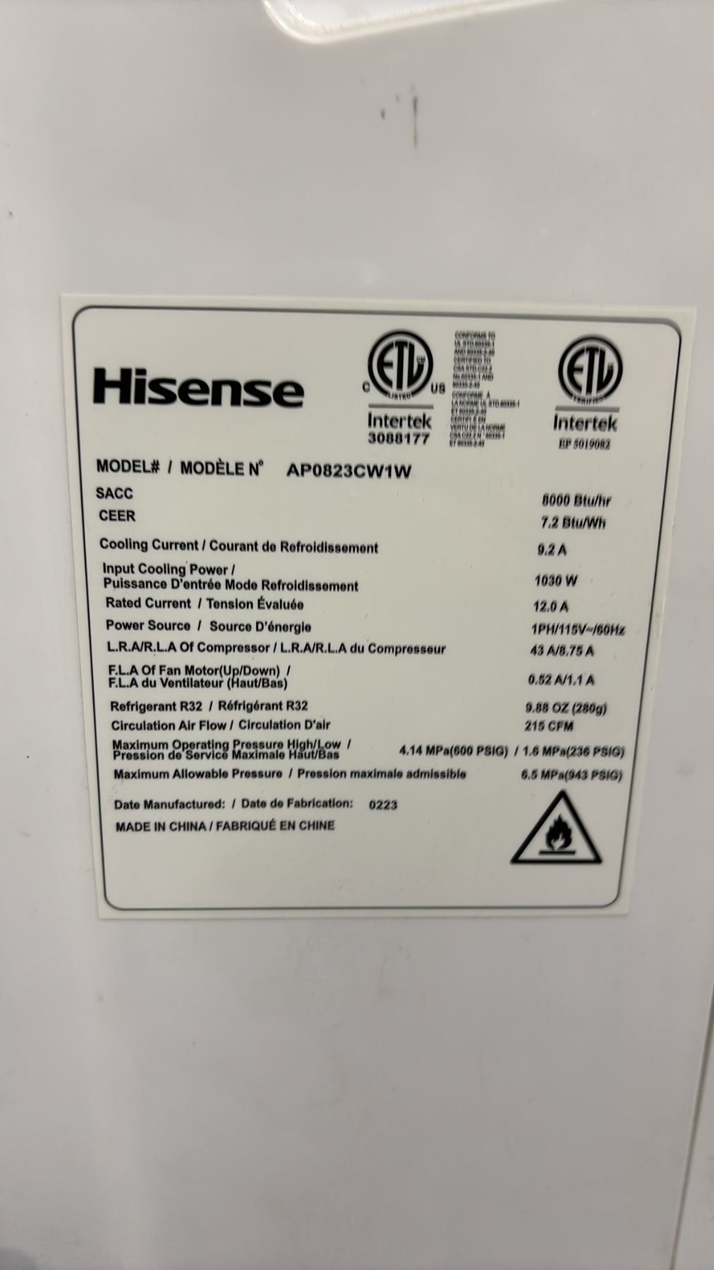 Lot 34 HISENSE 8,000 BTU PORTABLE AIR CONDITIONER (NO HOSE, NO REMOTE, NO ACCESSORIES)