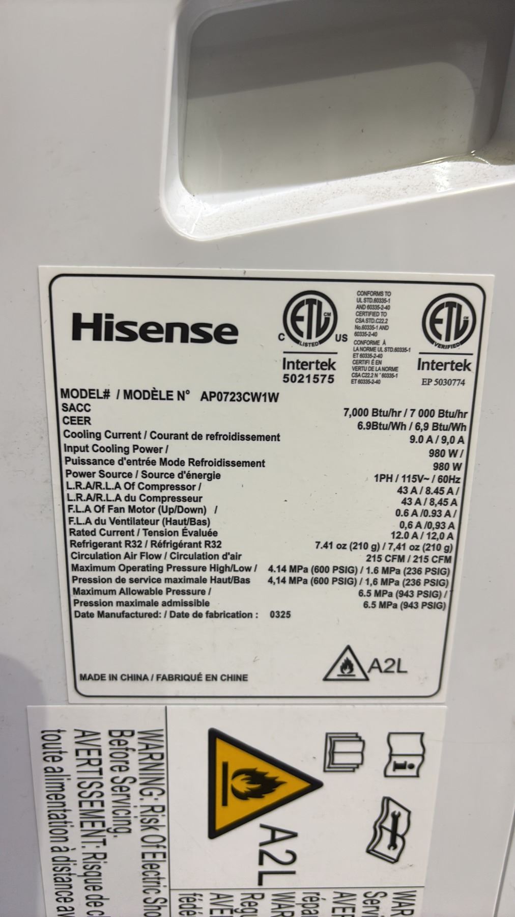 HISENSE 7,000 BTU PORTABLE AIR CONDITIONER (NO HOSE, NO REMOTE, NO ACCESSORIES)