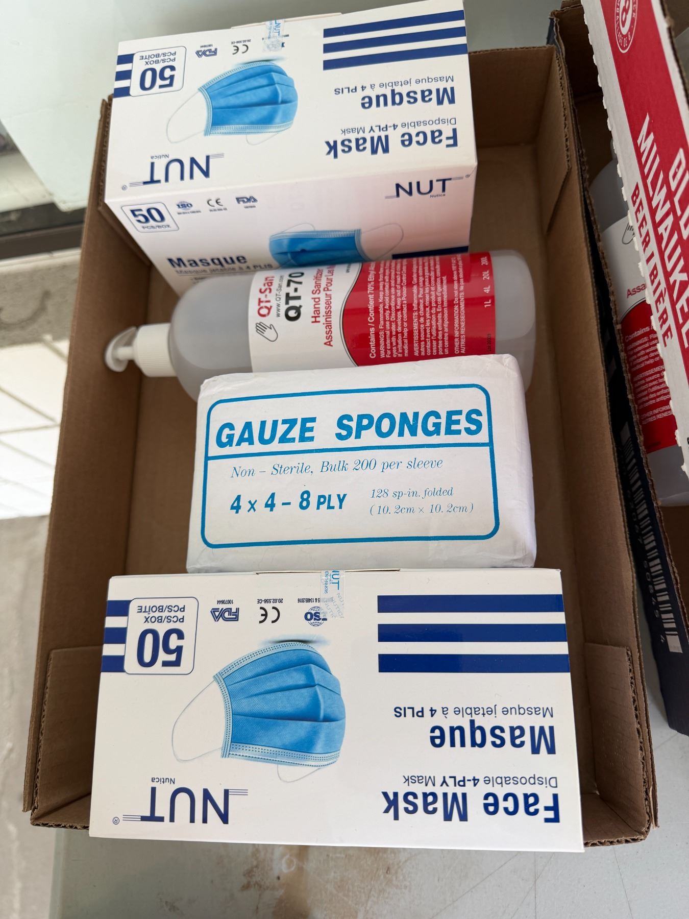 Face, masks, gauze, sponges, and hand sanitizer