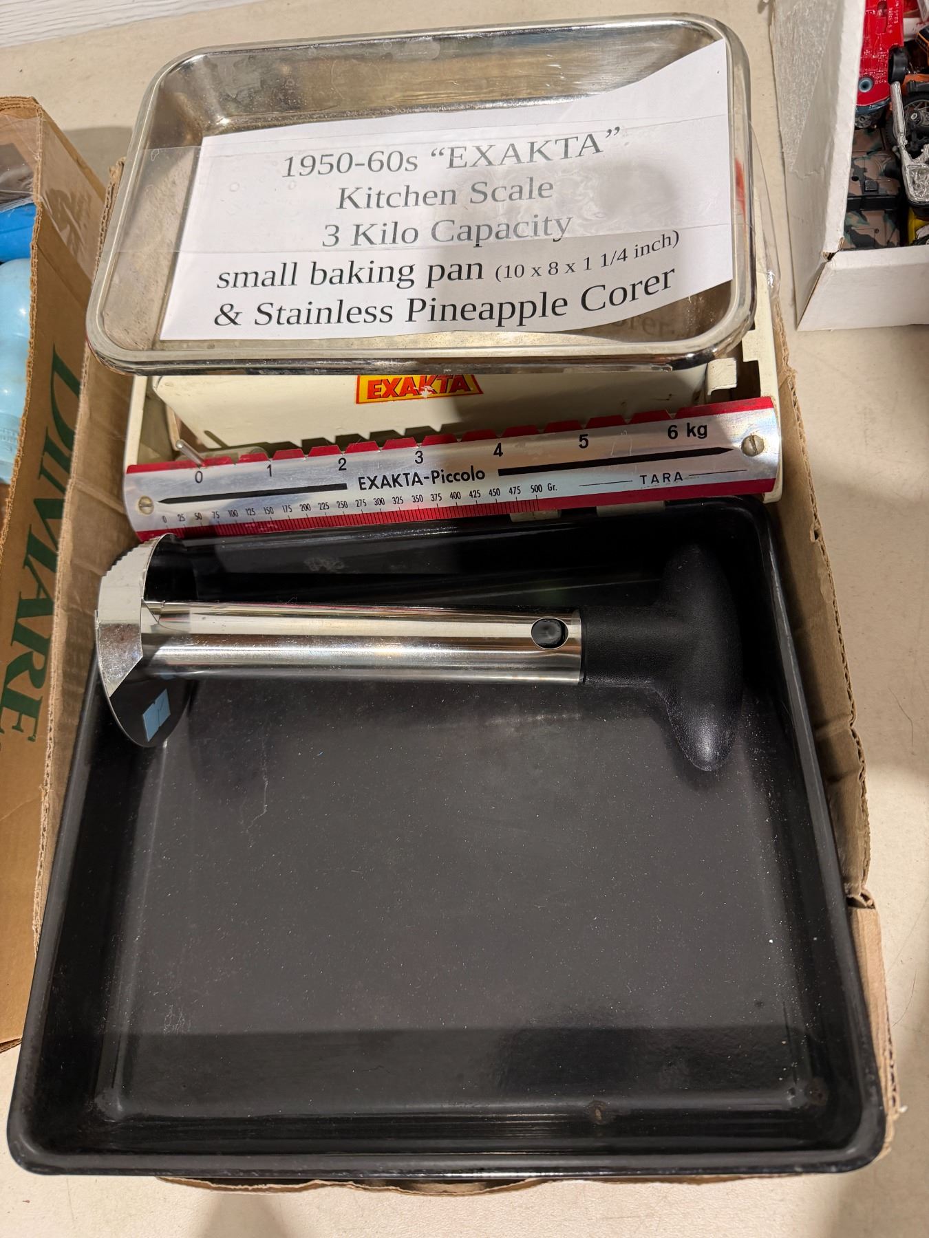 Lot 865 Kitchen skill, Vintage EXAKTA and small baking pan and pineapple, corer